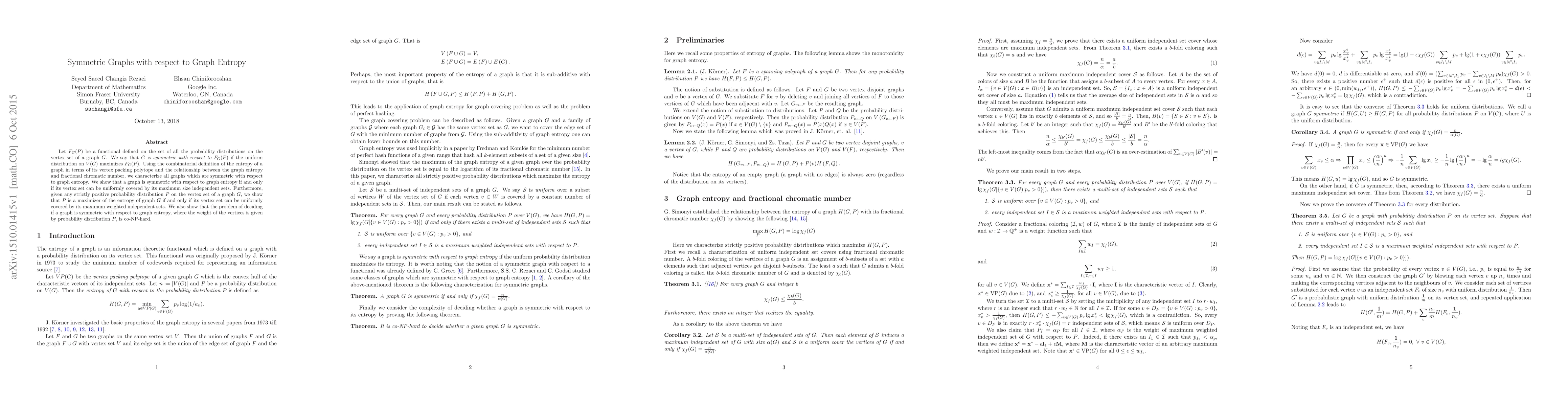 Let $F_G(P)$ be a functional defined on the set of all the probability distributions on the vertex set of a graph $G$. We say that $G$ is \emph{symmetric with respect to $F_G(P)$} if the uniform distribution on $V(G)$ maximizes $F_G(P)$. Using the combinatorial definition of the entropy of a graph in terms of its vertex packing polytope and the relationship between the graph entropy and fractional chromatic number, we characterize all graphs which are symmetric with respect to graph entropy. We show that a graph is symmetric with respect to graph entropy if and only if its vertex set can be uniformly covered by its maximum size independent sets. Furthermore, given any strictly positive probability distribution $P$ on the vertex set of a graph $G$, we show that $P$ is a maximizer of the entropy of graph $G$ if and only if its vertex set can be uniformly covered by its maximum weighted independent sets. We also show that the problem of deciding if a graph is symmetric with respect to graph entropy, where the weight of the vertices is given by probability distribution $P$, is co-NP-hard.