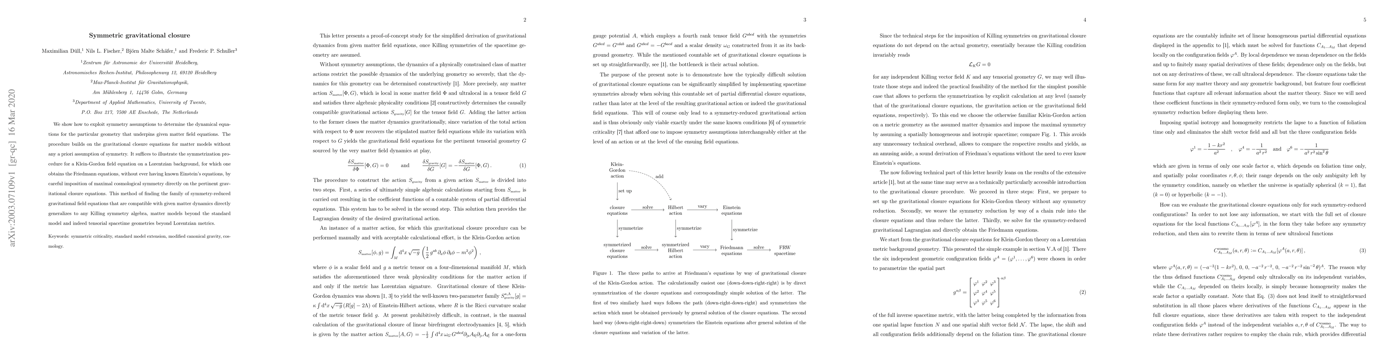 We show how to exploit symmetry assumptions to determine the dynamical equations for the particular geometry that underpins given matter field equations. The procedure builds on the gravitational closure equations for matter models without any a priori assumption of symmetry. It suffices to illustrate the symmetrization procedure for a Klein-Gordon field equation on a Lorentzian background, for which one obtains the Friedmann equations, without ever having known Einstein's equations, by careful imposition of maximal cosmological symmetry directly on the pertinent gravitational closure equations. This method of finding the family of symmetry-reduced gravitational field equations that are compatible with given matter dynamics directly generalizes to any Killing symmetry algebra, matter models beyond the standard model and indeed tensorial spacetime geometries beyond Lorentzian metrics.