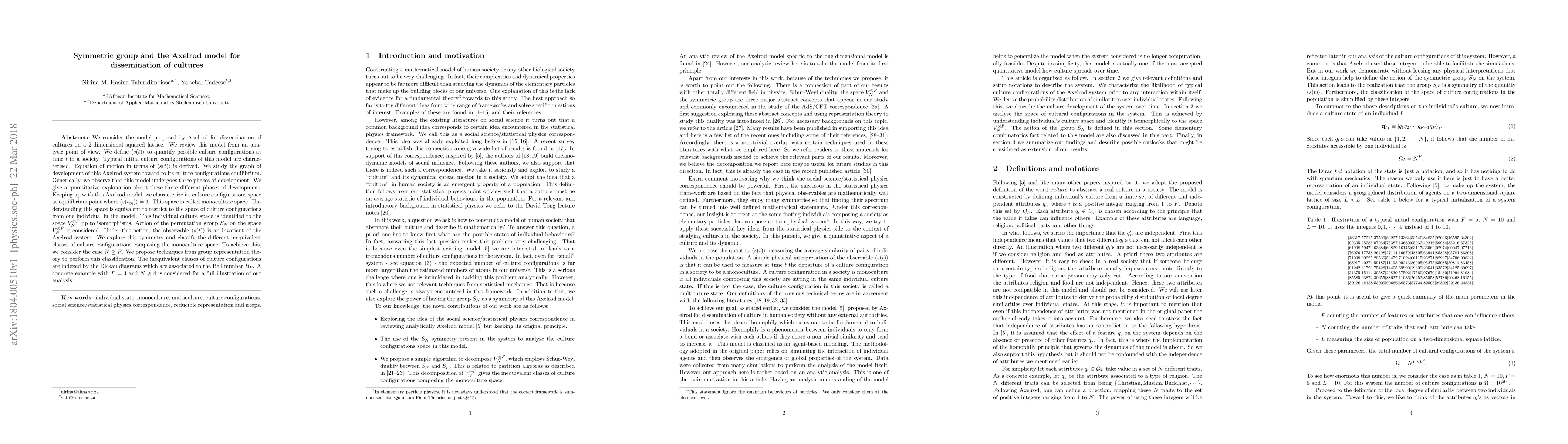 This paper analyzes Axelrod's model for cultural dissemination on a 2-dimensional lattice, deriving an equation of motion for culture configurations and identifying three phases of development. It employs symmetry from the permutation group $S_N$ to classify culture configurations at equilibrium, using group representation theory and Dickau diagrams.
