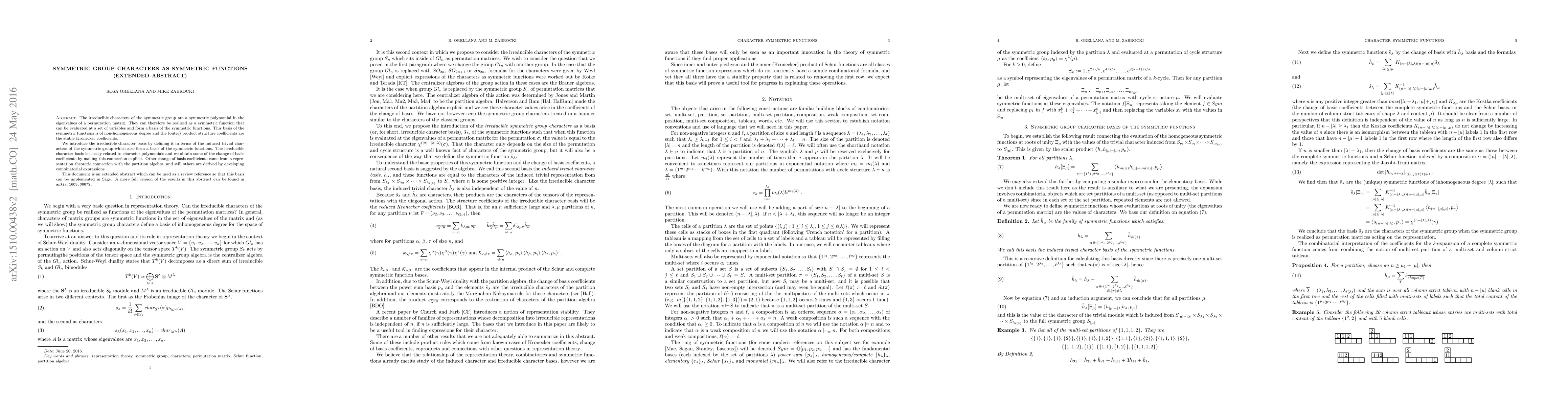 The irreducible characters of the symmetric group are a symmetric polynomial in the eigenvalues of a permutation matrix. They can therefore be realized as a symmetric function that can be evaluated at a set of variables and form a basis of the symmetric functions. This basis of the symmetric functions is of non-homogeneous degree and the (outer) product structure coefficients are the stable Kronecker coefficients. We introduce the irreducible character basis by defining it in terms of the induced trivial characters of the symmetric group which also form a basis of the symmetric functions. The irreducible character basis is closely related to character polynomials and we obtain some of the change of basis coefficients by making this connection explicit. Other change of basis coefficients come from a representation theoretic connection with the partition algebra, and still others are derived by developing combinatorial expressions. This document is an extended abstract which can be used as a review reference so that this basis can be implemented in Sage. A more complete version of the results in this abstract can be found in {\tt arXiv:1605.06672}.