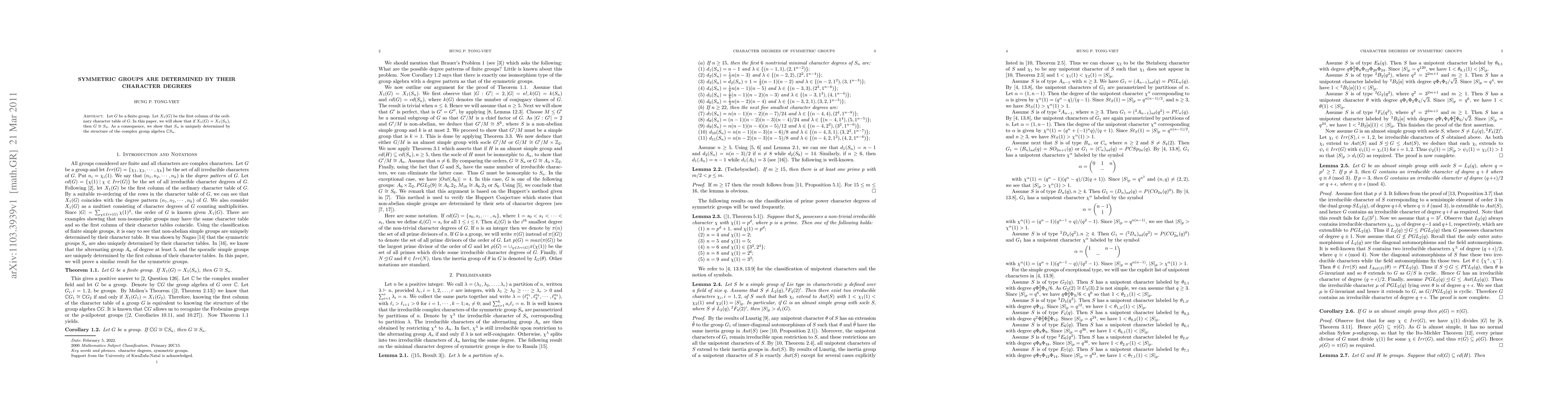 Let $G$ be a finite group. Let $X_1(G)$ be the first column of the ordinary character table of $G.$ In this paper, we will show that if $X_1(G)=X_1(S_n),$ then $G\cong S_n.$ As a consequence, we show that $S_n$ is uniquely determined by the structure of the complex group algebra $\C S_n.$