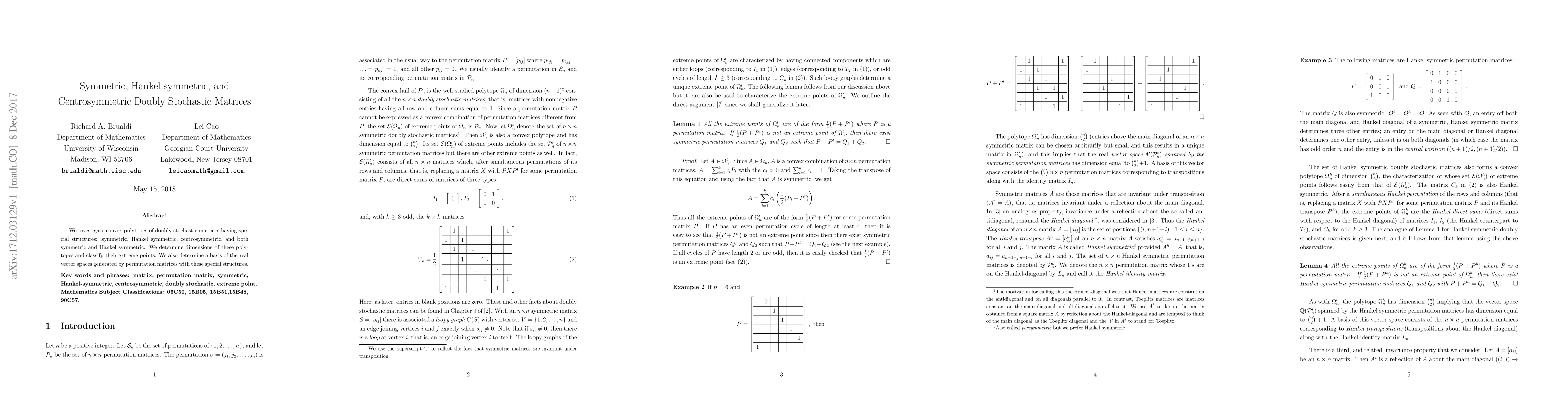 The paper provides a comprehensive analysis of the convex hulls of doubly stochastic matrices with various symmetries, including explicit determination of dimensions and bases for the associated vector spaces.