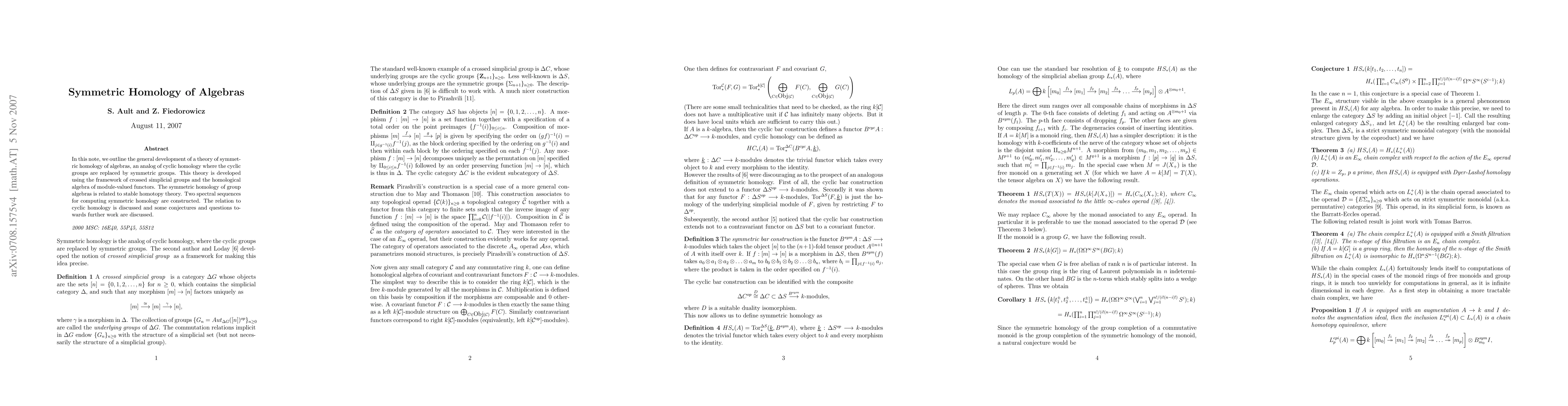 The paper develops symmetric homology for algebras, analogous to cyclic homology but using symmetric groups instead of cyclic groups, leveraging crossed simplicial groups and module-valued functors. It also connects symmetric homology of group algebras to stable homotopy theory and proposes two spectral sequences for its computation.