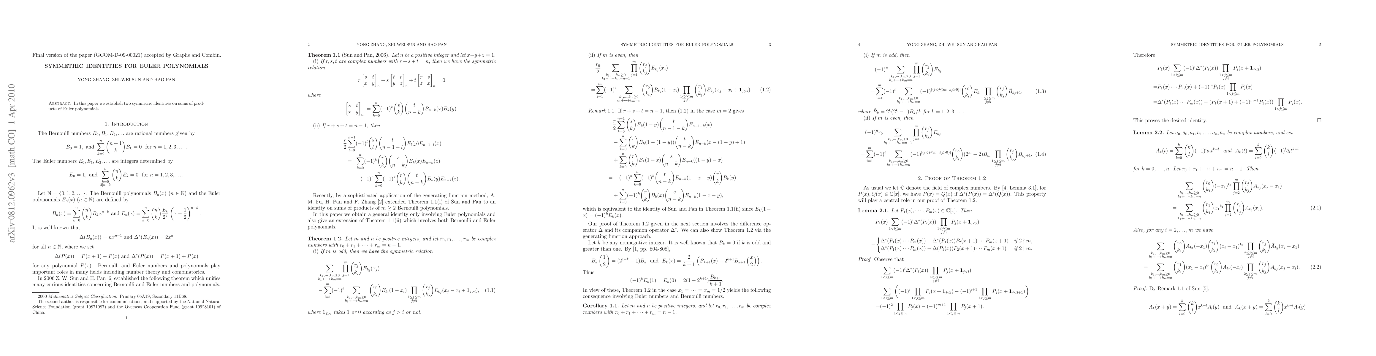 Summary: This paper presents two symmetric identities concerning sums of products of Euler polynomials, contributing to the understanding of their algebraic properties. The identities provide new insights into the relationships between these polynomials.