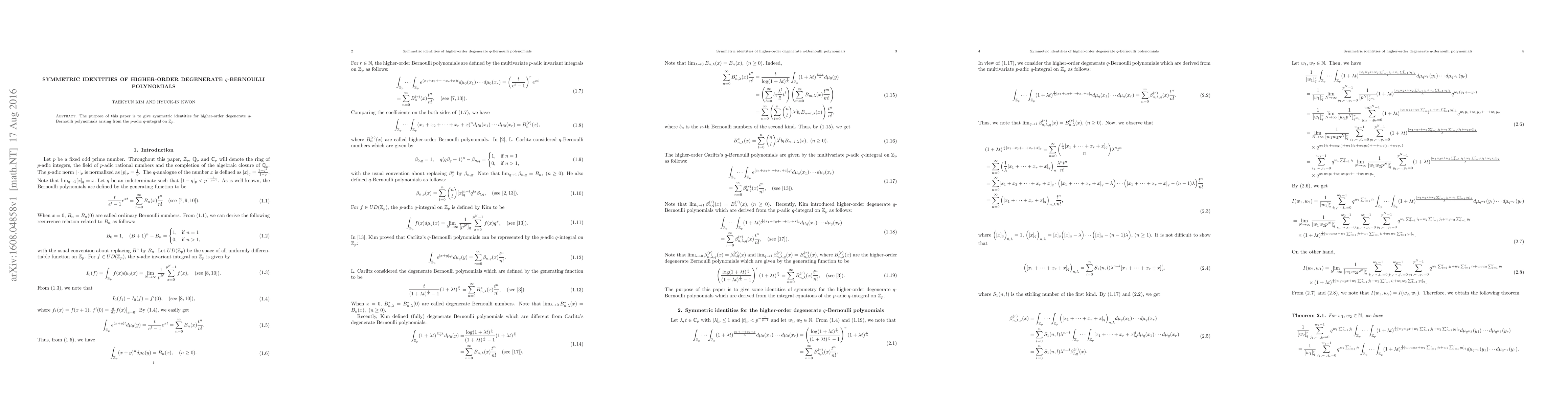 Summary: This paper derives symmetric identities for higher-order degenerate q-Bernoulli polynomials using the p-adic q-integral on Zp, exploring their mathematical properties and relationships. The identities provide deeper insights into the structure of these specialized polynomials.