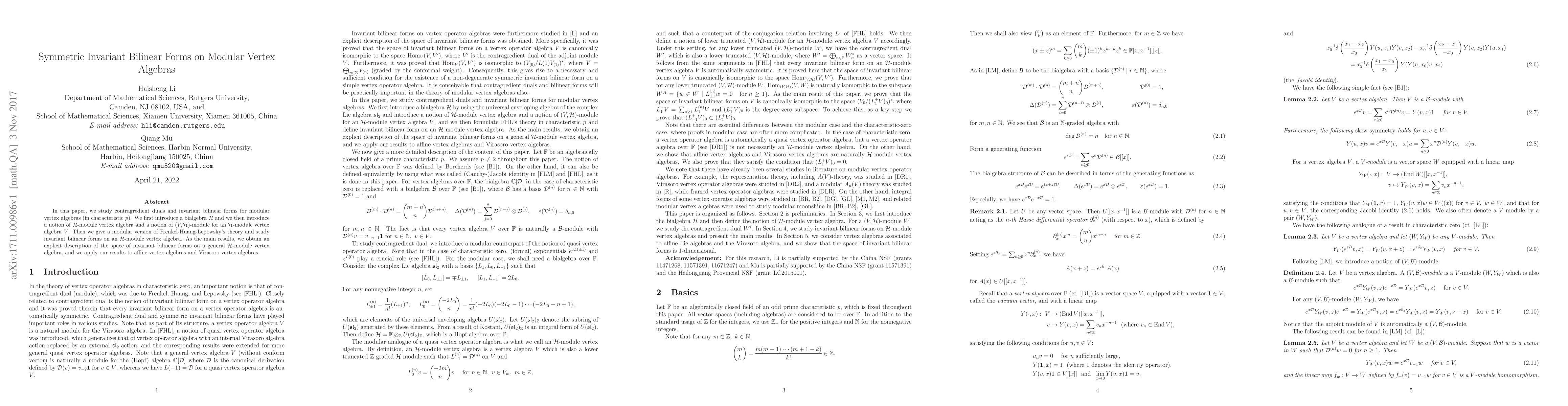 The paper studies symmetric invariant bilinear forms on modular vertex algebras, introducing a bialgebra H and defining H-module vertex algebras and (V, H)-modules, extending Frenkel-Huang-Lepowsky's theory to a modular setting.
