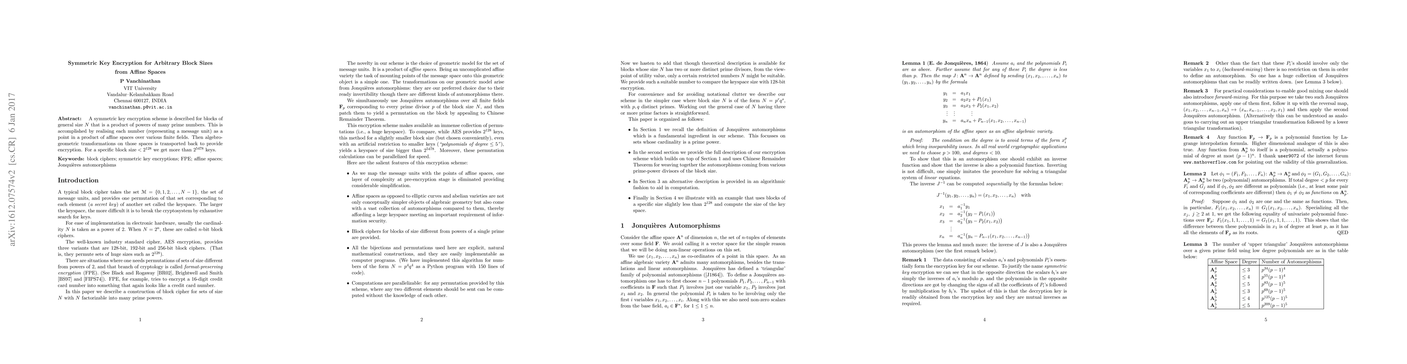 This paper proposes a symmetric key encryption scheme for arbitrary block sizes by mapping message units to points in affine spaces over finite fields and using algebro-geometric transformations for encryption, achieving over $2^{5478}$ keys for blocks smaller than $2^{128}$.