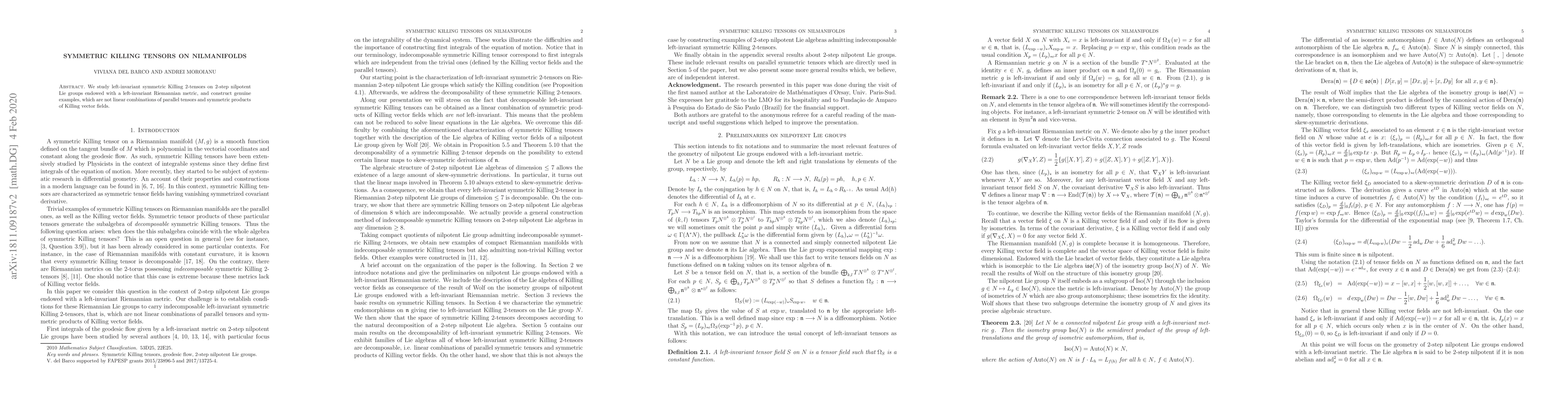 Summary: This paper investigates left-invariant symmetric Killing 2-tensors on 2-step nilpotent Lie groups with a left-invariant Riemannian metric, presenting genuine examples that are not derived from parallel tensors or symmetric products of Killing vector fields.