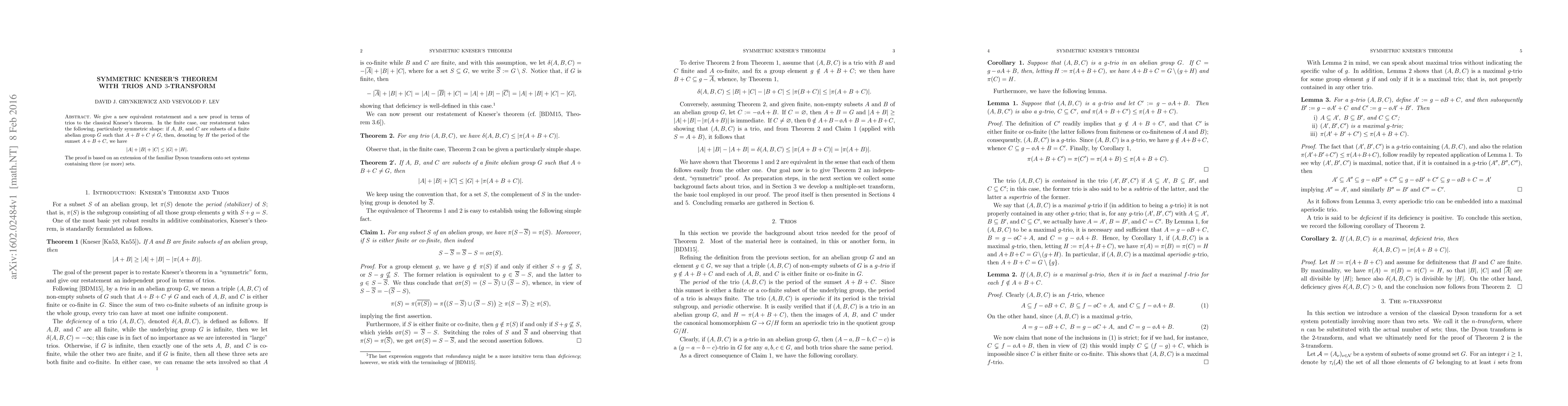 Summary: This paper presents a symmetric reformulation and proof of Kneser's theorem using trios, showing that for subsets $A$, $B$, and $C$ of a finite abelian group $G$ where $A+B+C \ne G$, the inequality $|A|+|B|+|C| \le |G|+|H|$ holds, where $H$ is the period of $A+B+C$. The proof is achieved through an extension of the Dyson transform to three-set systems.
