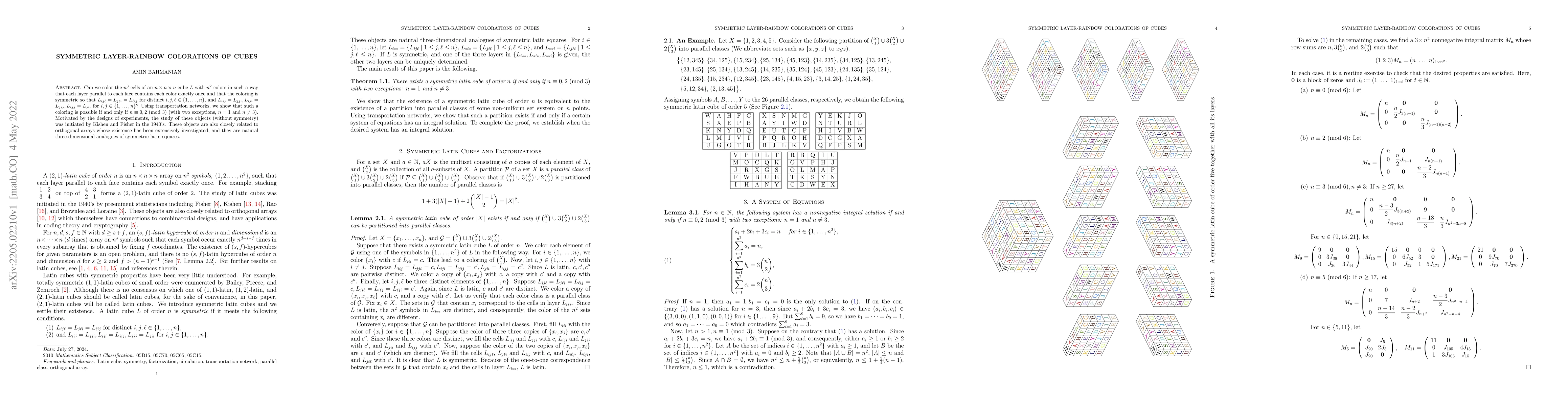 Can we color the $n^3$ cells of an $n\times n\times n$ cube $L$ with $n^2$ colors in such a way that each layer parallel to each face contains each color exactly once and that the coloring is symmetric so that $L_{ij\ell}=L_{j\ell i}=L_{\ell ij}$ for distinct $i,j,\ell \in \{1,\dots,n\}$, and $L_{iij}=L_{jj i}, L_{iji}=L_{jij}, L_{ij j}=L_{jii}$ for $i,j\in \{1,\dots,n\}$? Using transportation networks, we show that such a coloring is possible if and only if $n\equiv 0,2 \mod 3$ (with two exceptions, $n=1$ and $n\neq 3$). Motivated by the designs of experiments, the study of these objects (without symmetry) was initiated by Kishen and Fisher in the 1940's. These objects are also closely related to orthogonal arrays whose existence has been extensively investigated, and they are natural three-dimensional analogues of symmetric latin squares.