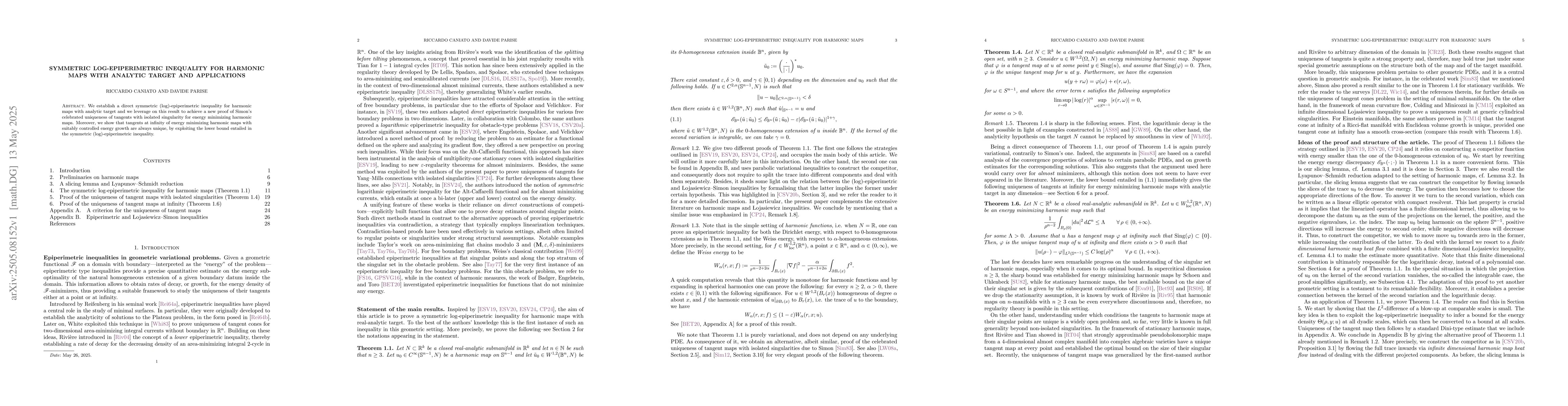 The paper presents a symmetric log-epiperimetric inequality tailored for harmonic maps with analytic targets, leading to a new proof of Simon's uniqueness theorem and insights on unique tangents at infinity.