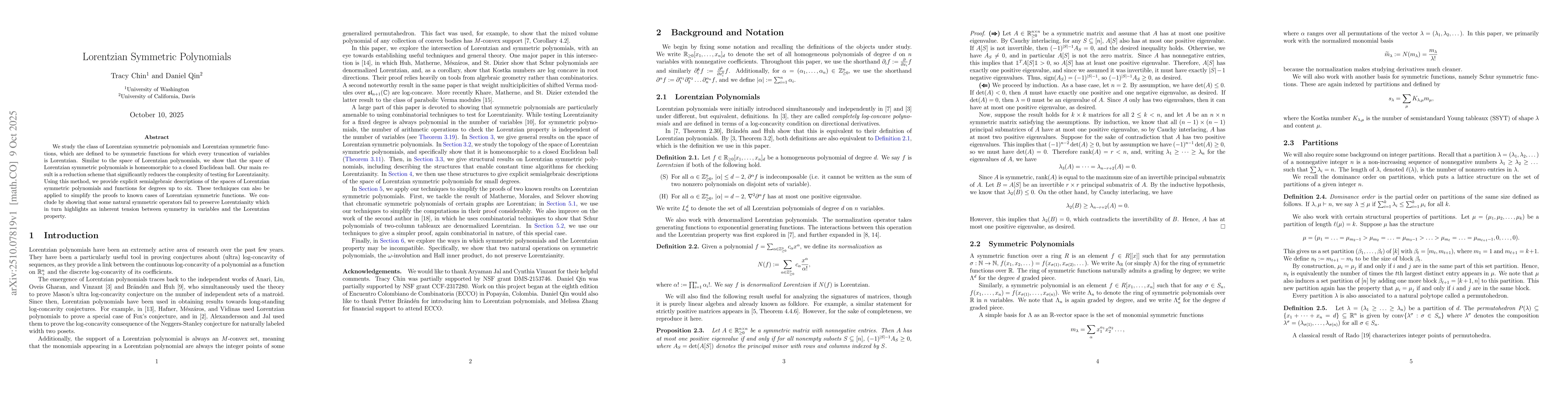 This work advances understanding of the interplay between Lorentzian polynomials and symmetric function theory, providing both theoretical insights and computational tools for analyzing combinatorial structures with log-concave properties.
