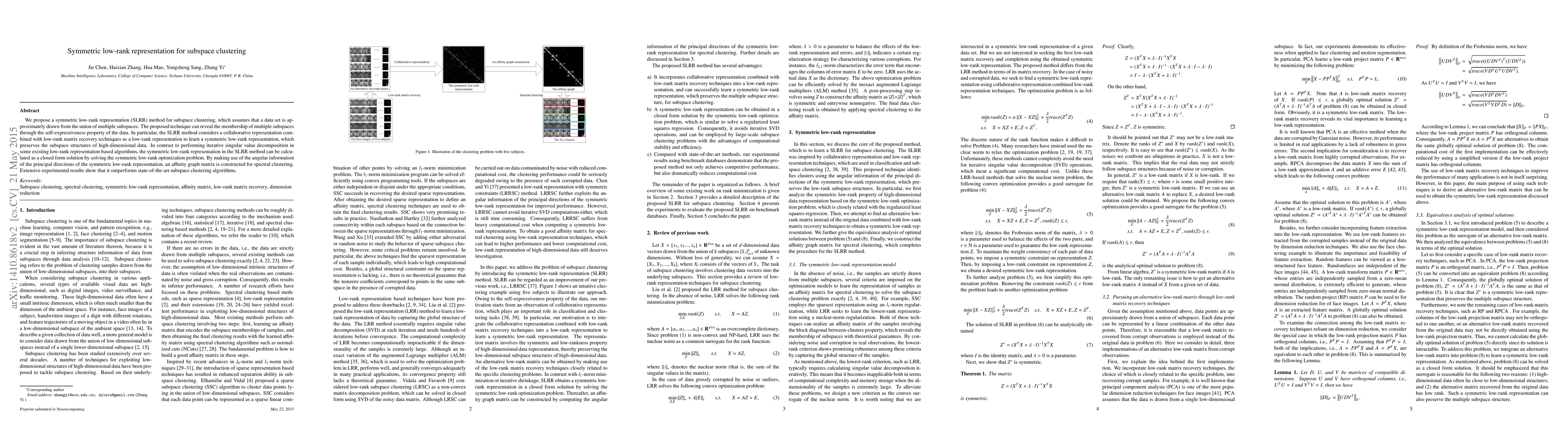 The paper introduces a symmetric low-rank representation (SLRR) method for subspace clustering, which uses self-expressiveness to identify data membership in multiple subspaces. Unlike iterative methods, SLRR provides a closed-form solution and outperforms existing algorithms through spectral clustering based on principal direction information.