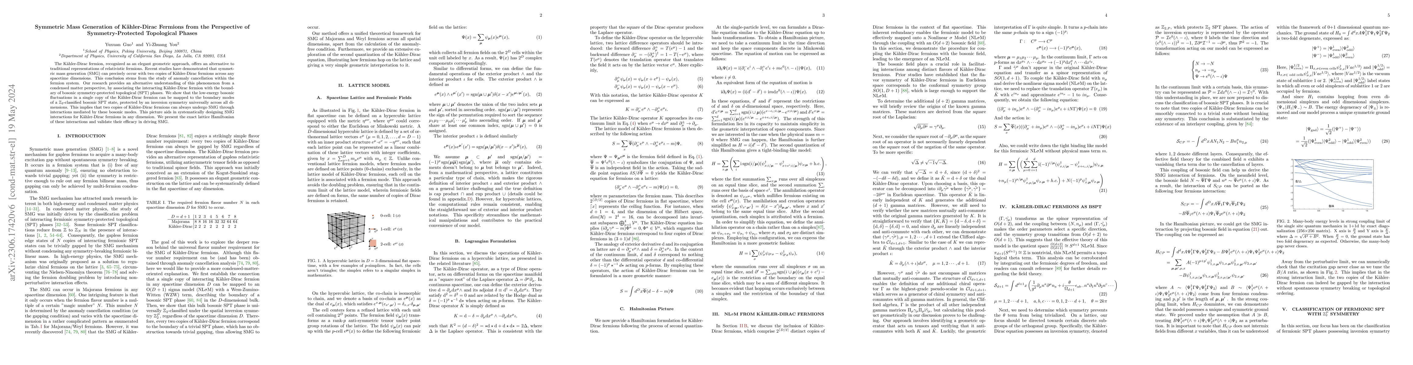 This paper explores symmetric mass generation (SMG) for Kähler-Dirac fermions, revealing that two copies can generate mass through interactions with bosonic modes, which are akin to boundary states of symmetry-protected topological phases. The study provides a condensed matter perspective on SMG in any spacetime dimension.