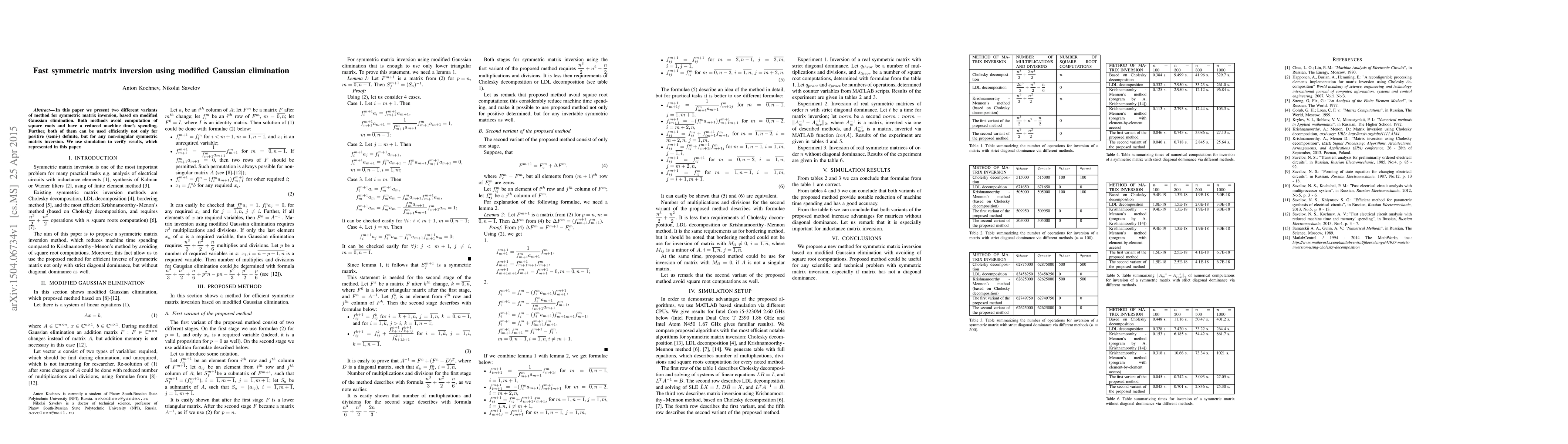 In this paper we present two different variants of method for symmetric matrix inversion, based on modified Gaussian elimination. Both methods avoid computation of square roots and have a reduced machine time's spending. Further, both of them can be used efficiently not only for positive (semi-) definite, but for any non-singular symmetric matrix inversion. We use simulation to verify results, which represented in this paper.