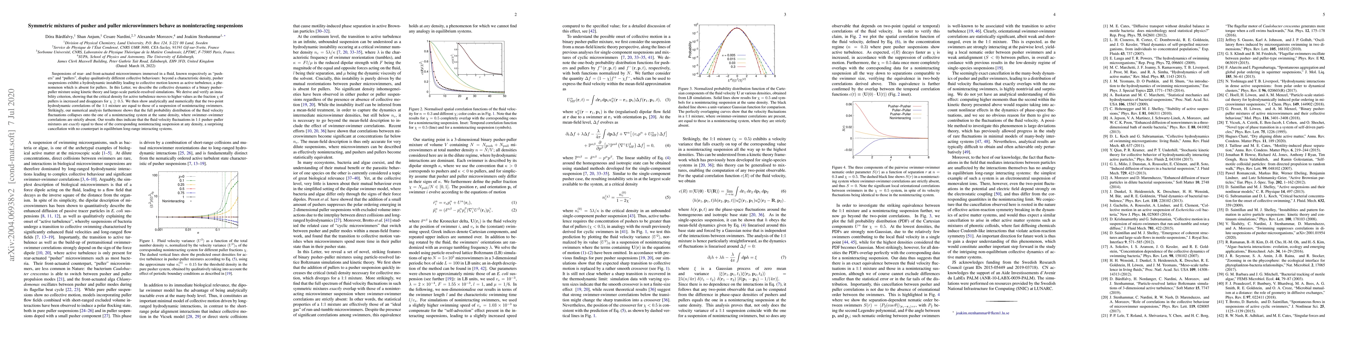 Suspensions of rear- and front-actuated microswimmers immersed in a fluid, known respectively as ``pushers'' and ``pullers'', display qualitatively different collective behaviours: beyond a characteristic density, pusher suspensions exhibit a hydrodynamic instability leading to collective motion known as active turbulence, a phenomenon which is absent for pullers. In this Letter, we describe the collective dynamics of a binary pusher--puller mixture using kinetic theory and large-scale particle-resolved simulations. We derive and verify an instability criterion, showing that the critical density for active turbulence moves to higher values as the fraction $\chi$ of pullers is increased and disappears for $\chi \geq 0.5$. We then show analytically and numerically that the two-point hydrodynamic correlations of the 1:1 mixture are equal to those of a suspension of noninteracting swimmers. Strikingly, our numerical analysis furthermore shows that the full probability distribution of the fluid velocity fluctuations collapses onto the one of a noninteracting system at the same density, where swimmer--swimmer correlations are strictly absent. Our results thus indicate that the fluid velocity fluctuations in 1:1 pusher--puller mixtures are exactly equal to those of the corresponding noninteracting suspension at any density, a surprising cancellation with no counterpart in equilibrium long-range interacting systems.