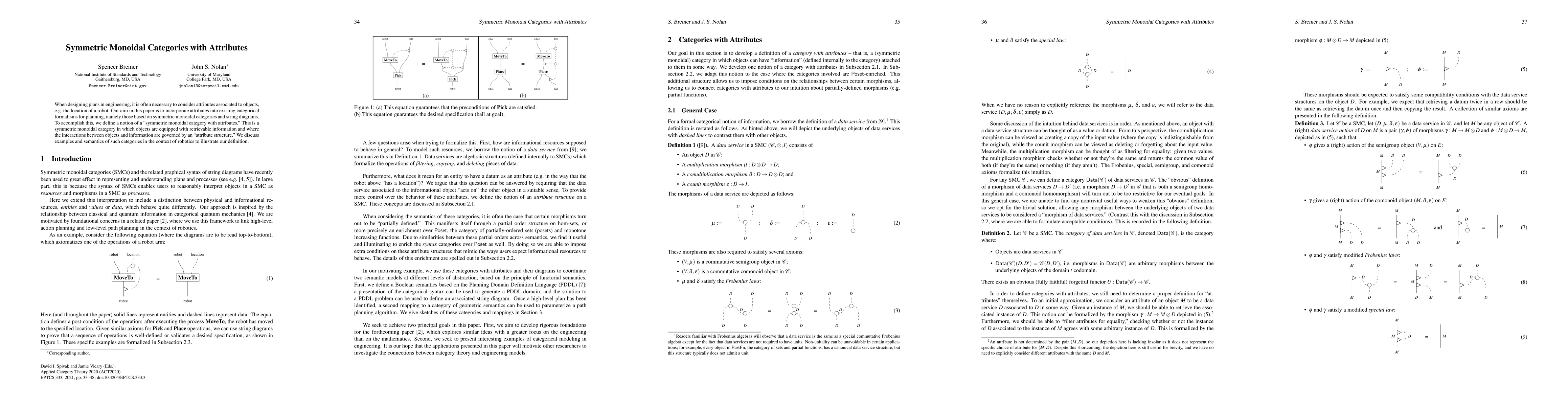 This paper introduces the concept of symmetric monoidal categories with attributes, extending existing categorical planning frameworks to incorporate object-associated information like robot locations. It defines an attribute structure governing interactions and provides examples and semantics in robotics.