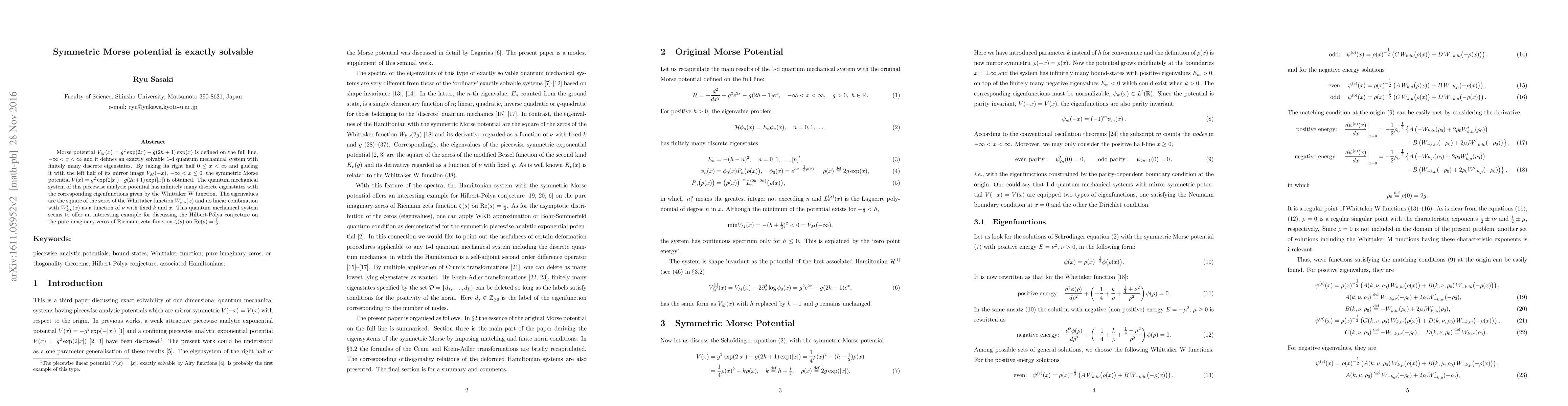 The symmetric Morse potential is exactly solvable, with infinitely many discrete eigenstates, offering a unique example for discussing the Hilbert-Polya conjecture on pure imaginary zeros of the Riemann zeta function.