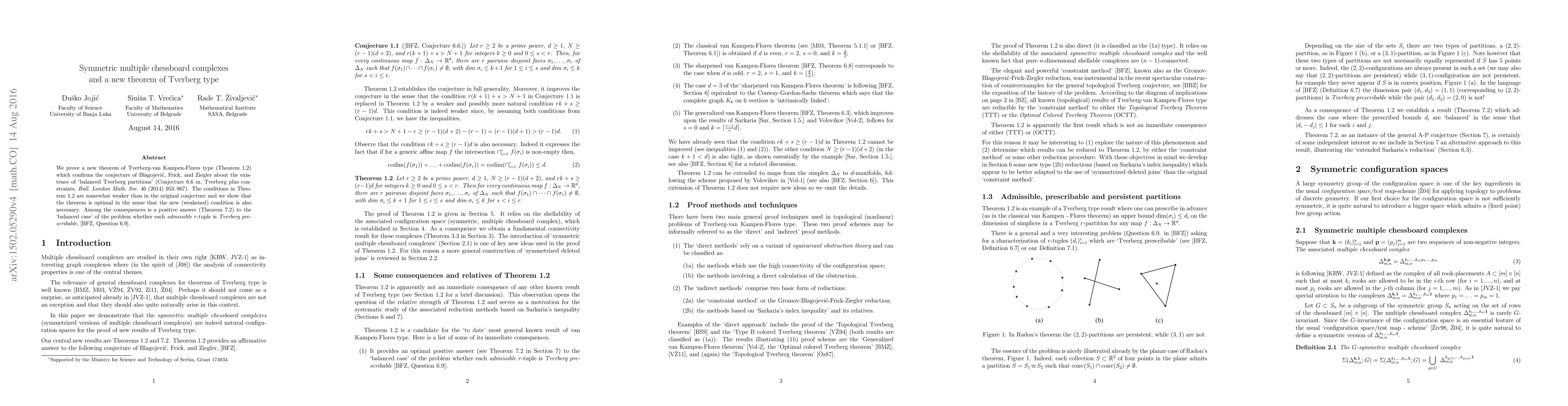 This paper proves a new Tverberg-type theorem confirming a conjecture on "balanced Tverberg partitions," utilizing the connectivity and shellability properties of multiple chessboard complexes and their symmetric variants.