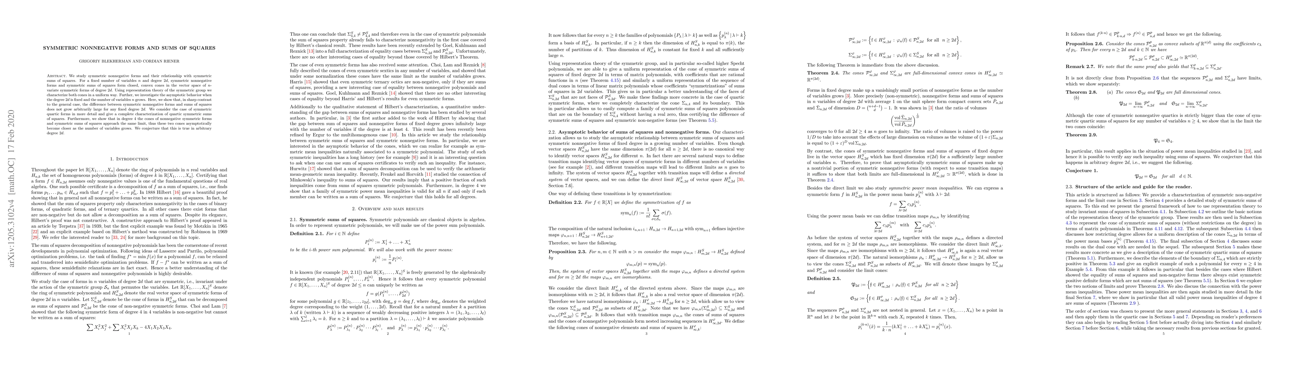 We study symmetric nonnegative forms and their relationship with symmetric sums of squares. For a fixed number of variables $n$ and degree $2d$, symmetric nonnegative forms and symmetric sums of squares form closed, convex cones in the vector space of $n$-variate symmetric forms of degree $2d$. Using representation theory of the symmetric group we characterize both cones in a uniform way. Further, we investigate the asymptotic behavior when the degree $2d$ is fixed and the number of variables $n$ grows. Here, we show that, in sharp contrast to the general case, the difference between symmetric nonnegative forms and sums of squares does not grow arbitrarily large for any fixed degree $2d$. We consider the case of symmetric quartic forms in more detail and give a complete characterization of quartic symmetric sums of squares. Furthermore, we show that in degree $4$ the cones of nonnegative symmetric forms and symmetric sums of squares approach the same limit, thus these two cones asymptotically become closer as the number of variables grows. We conjecture that this is true in arbitrary degree $2d$.