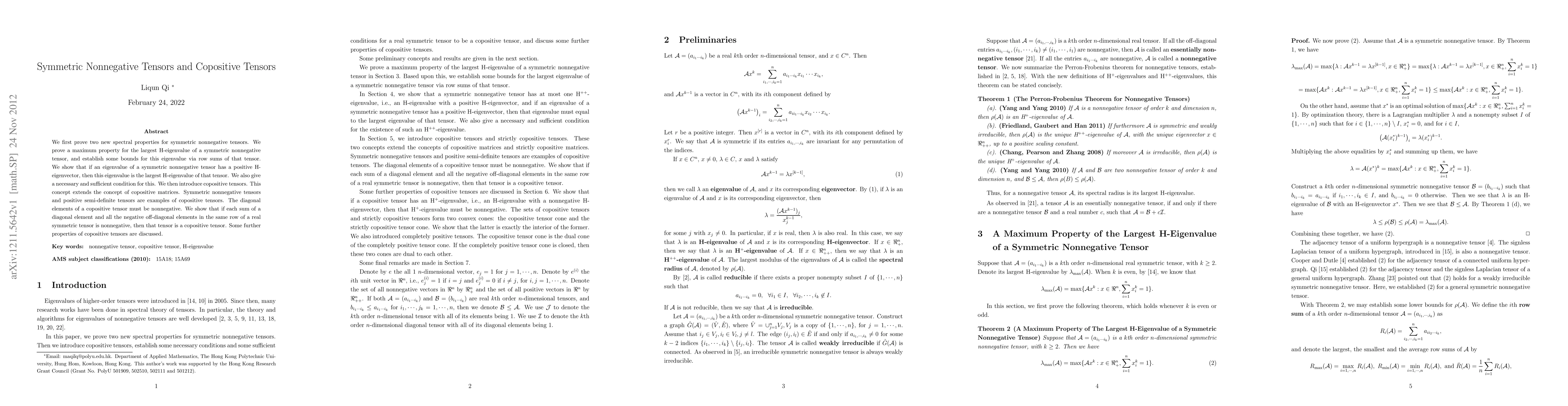This paper establishes new spectral properties for symmetric nonnegative tensors, including a maximum property for the largest H-eigenvalue and bounds via row sums. It introduces copositive tensors, extending copositive matrices, and provides conditions for tensors to be copositive based on the nonnegativity of diagonal elements and sums of diagonal and negative off-diagonal elements.