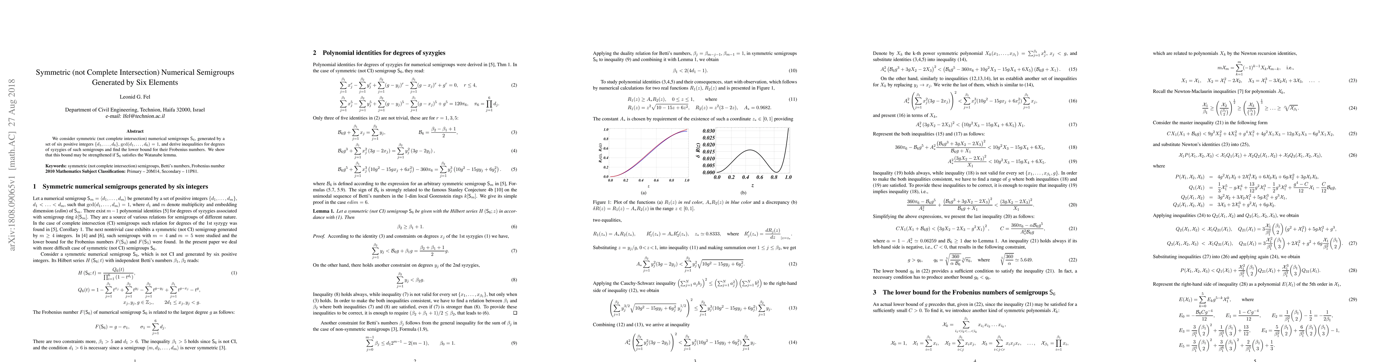 We consider symmetric (not complete intersection) numerical semigroups S_6, generated by a set of six positive integers {d_1,...,d_6}, gcd(d_1,...,d_6)=1, and derive inequalities for degrees of syzygies of such semigroups and find the lower bound for their Frobenius numbers. We show that this bound may be strengthened if S_6 satisfies the Watanabe lemma.