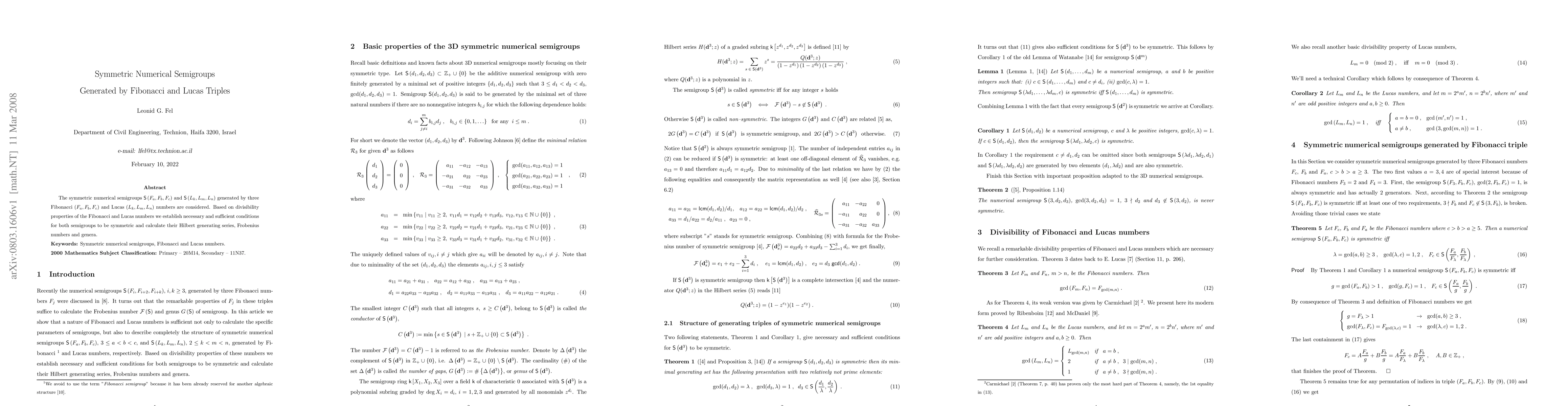 The symmetric numerical semigroups S(F_a,F_b,F_c) and S(L_k,L_m,L_n) generated by three Fibonacci (F_a,F_b,F_c) and Lucas (L_k,L_m,L_n) numbers are considered. Based on divisibility properties of the Fibonacci and Lucas numbers we establish necessary and sufficient conditions for both semigroups to be symmetric and calculate their Hilbert generating series, Frobenius numbers and genera.
