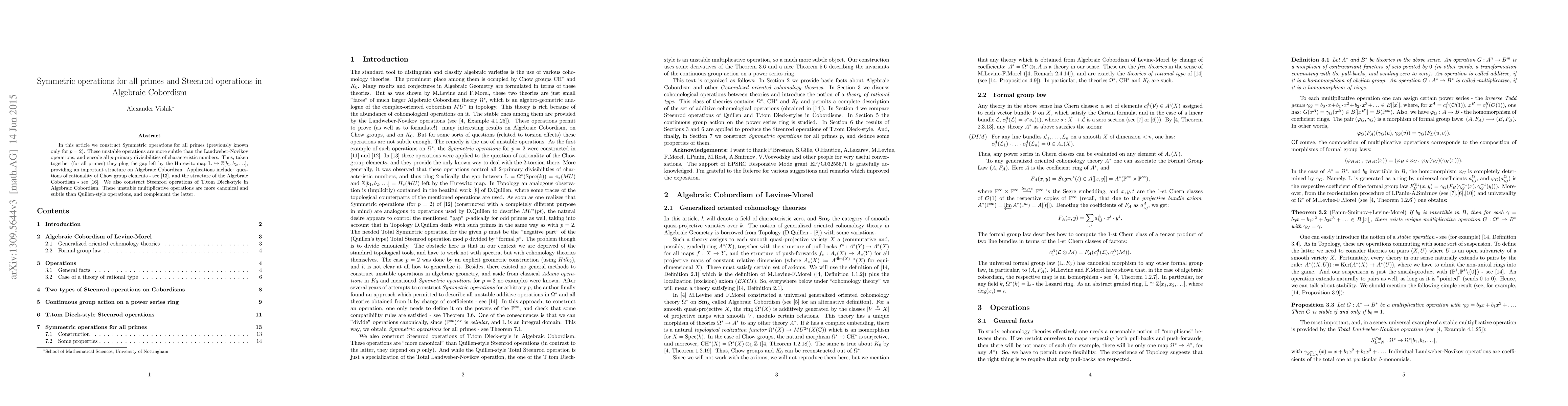 In this article we construct Symmetric operations for all primes (previously known only for p=2). These unstable operations are more subtle than the Landweber-Novikov operations, and encode all p-primary divisibilities of characteristic numbers. Thus, taken together (for all primes) they plug the gap left by the Hurewitz map L ---> Z[b_1,b_2,...], providing an important structure on Algebraic Cobordism. Applications include: questions of rationality of Chow group elements - see [11], and the structure of the Graded Algebraic Cobordism. We also construct Steenrod operations of T.tom Dieck-style in Algebraic Cobordism. These unstable multiplicative operations are more canonical and subtle than Quillen-style operations, and complement the latter.