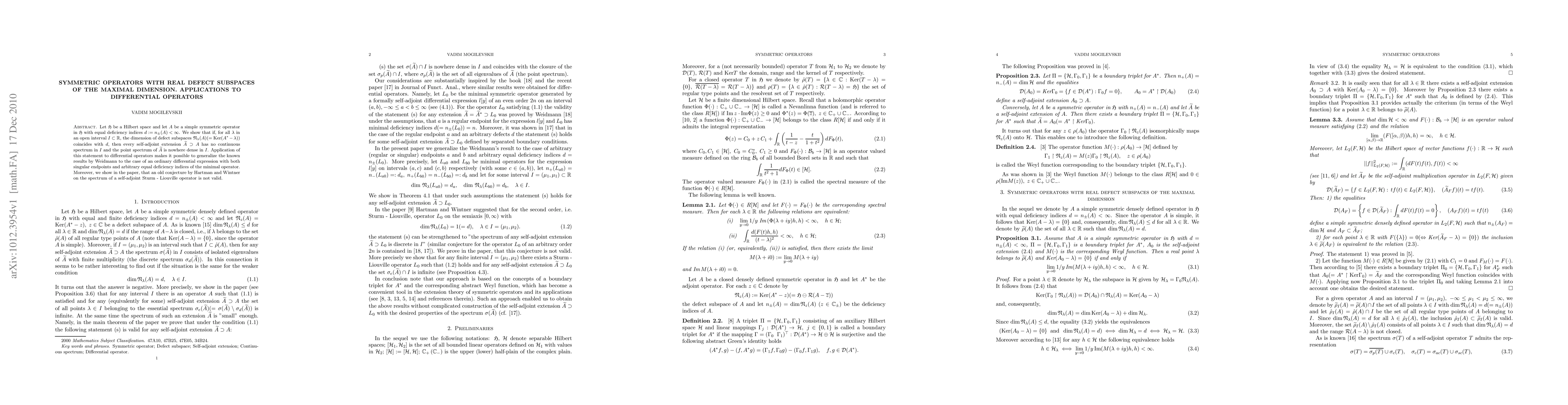 Let $\gH$ be a Hilbert space and let $A$ be a simple symmetric operator in $\gH$ with equal deficiency indices $d:=n_\pm(A)<\infty$. We show that if, for all $\l$ in an open interval $I\subset\bR$, the dimension of defect subspaces $\gN_\l(A)(=\Ker (A^*-\l))$ coincides with $d$, then every self-adjoint extension $\wt A\supset A$ has no continuous spectrum in $I$ and the point spectrum of $\wt A$ is nowhere dense in $I$. Application of this statement to differential operators makes it possible to generalize the known results by Weidmann to the case of an ordinary differential expression with both singular endpoints and arbitrary equal deficiency indices of the minimal operator. Moreover, we show in the paper, that an old conjecture by Hartman and Wintner on the spectrum of a self-adjoint Sturm - Liouville operator is not valid.