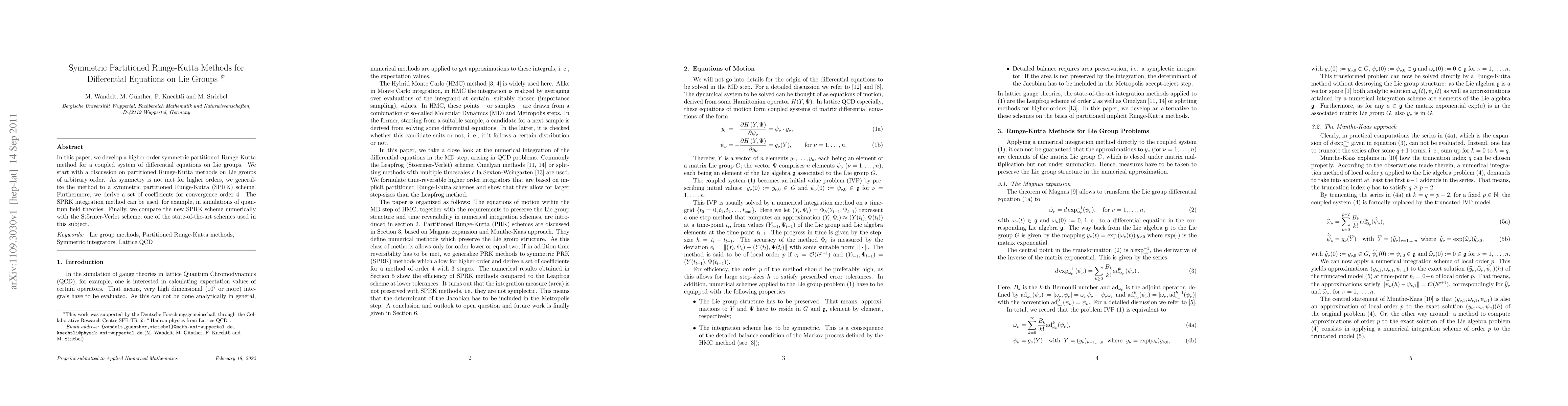 This paper develops a higher order symmetric partitioned Runge-Kutta method for solving coupled differential equations on Lie groups, addressing symmetry issues and deriving coefficients for order 4. The proposed SPRK method is shown to be effective in simulations of quantum field theories, with numerical comparisons against the St\"ormer-Verlet scheme.