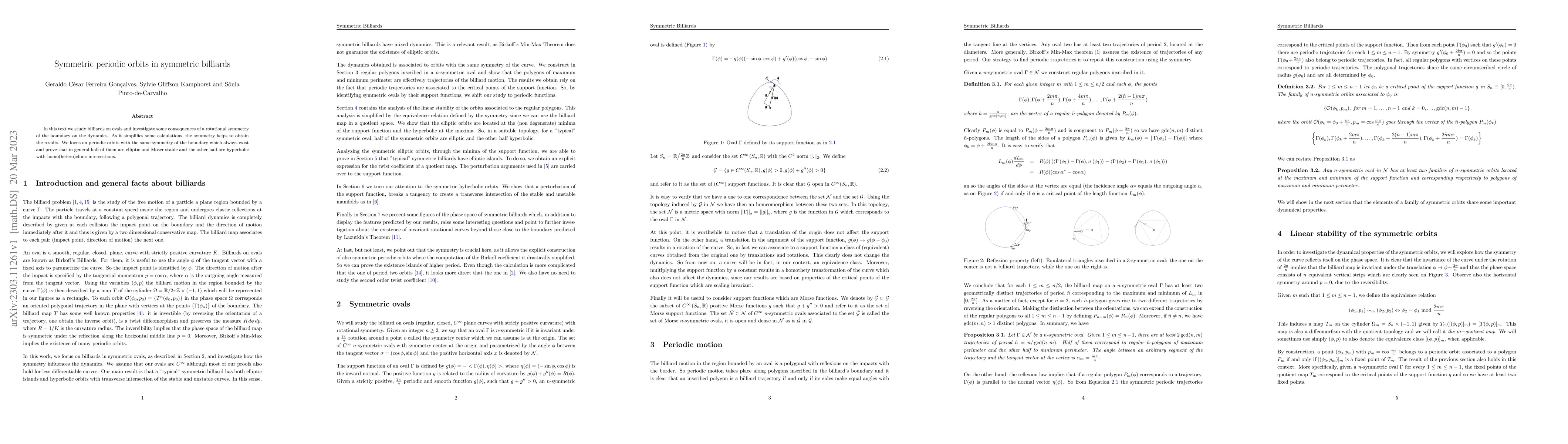 This paper examines the dynamics of billiards on ovals with rotationally symmetric boundaries, demonstrating that periodic orbits matching the boundary's symmetry always exist. It proves that half of these orbits are elliptic and Moser stable, while the other half are hyperbolic with homoclinic or heteroclinic intersections.