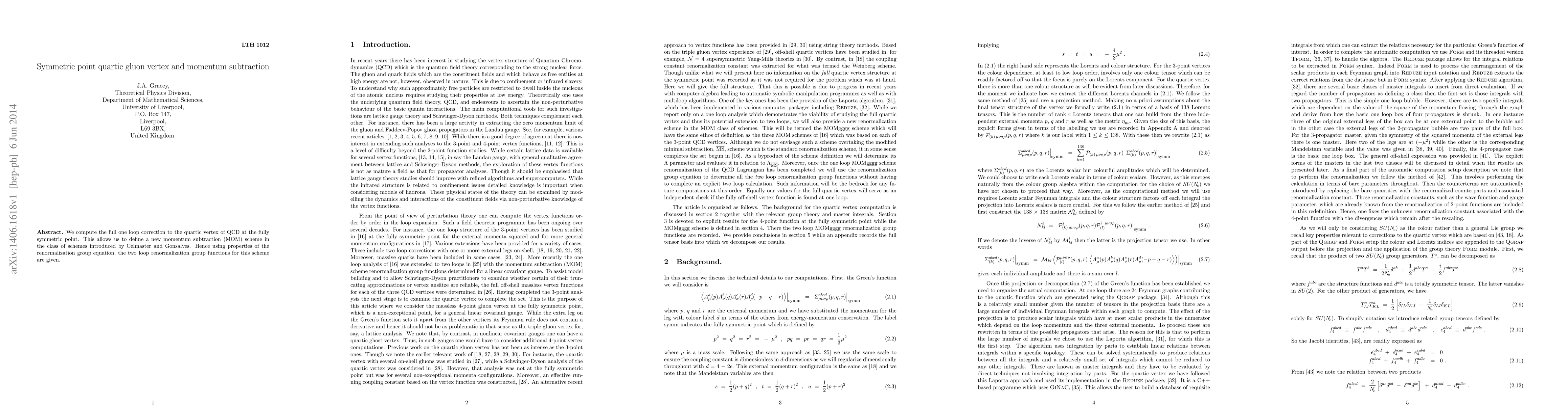 We compute the full one loop correction to the quartic vertex of QCD at the fully symmetric point. This allows us to define a new momentum subtraction (MOM) scheme in the class of schemes introduced by Celmaster and Gonsalves. Hence using properties of the renormalization group equation, the two loop renormalization group functions for this scheme are given.