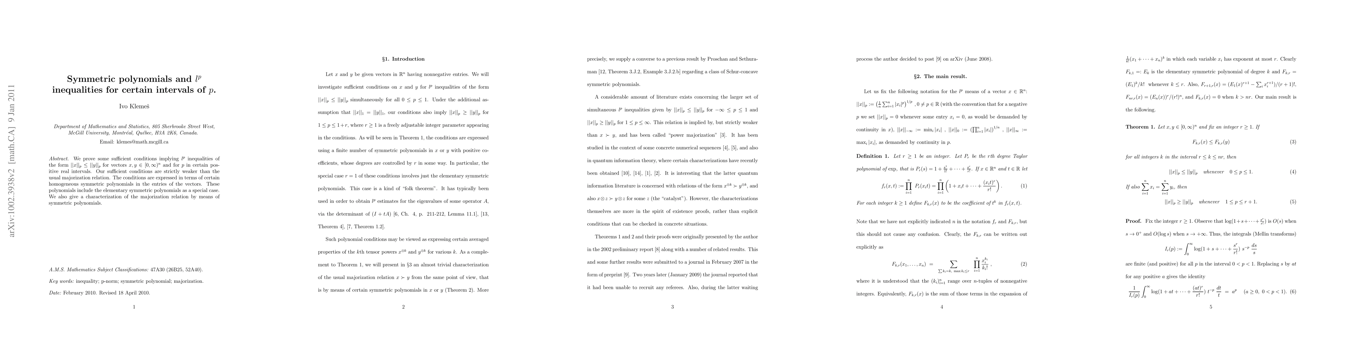 This paper establishes sufficient conditions for $l^p$ inequalities $||x||_p \leq ||y||_p$ for non-negative vectors, expressed in terms of symmetric polynomials, which are weaker than the usual majorization relation. It also characterizes the majorization relation using symmetric polynomials.