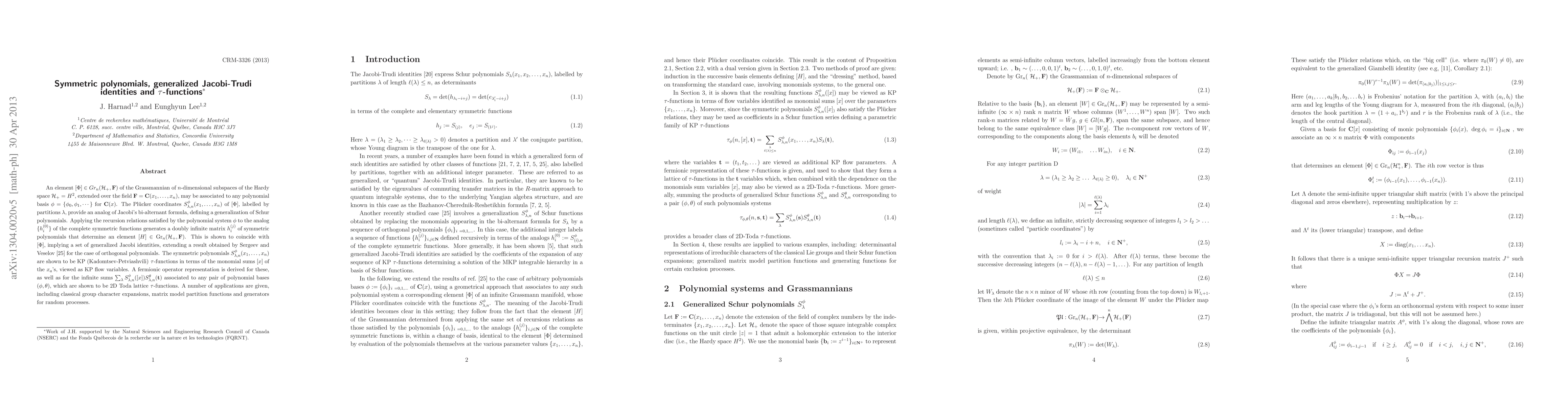 This paper explores the connection between symmetric polynomials, generalized Jacobi-Trudi identities, and τ-functions, establishing quantum Jacobi-Trudi identities for a Grassmannian element associated with polynomial bases. It demonstrates that these symmetric polynomials are KP tau-functions and provides a fermionic operator representation for them, linking to 2D Toda lattice τ-functions and applications in classical group character expansions and matrix model partition functions.