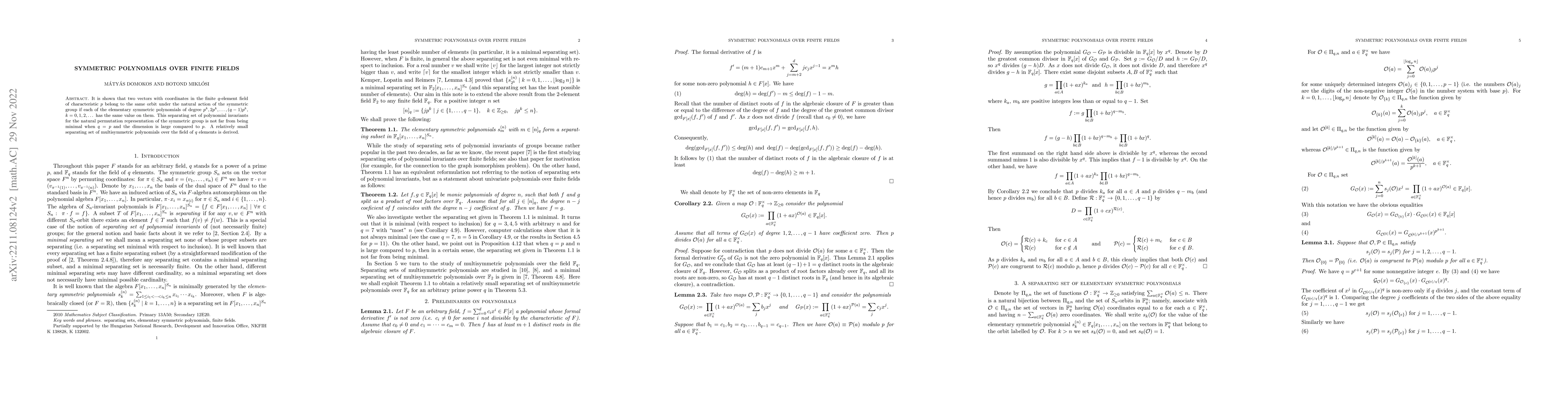 It is shown that two vectors with coordinates in the finite $q$-element field of characteristic $p$ belong to the same orbit under the natural action of the symmetric group if each of the elementary symmetric polynomials of degree $p^k,2p^k,\dots,(q-1)p^k$, $k=0,1,2,\dots$ has the same value on them. This separating set of polynomial invariants for the natural permutation representation of the symmetric group is not far from being minimal when $q=p$ and the dimension is large compared to $p$. A relatively small separating set of multisymmetric polynomials over the field of $q$ elements is derived.