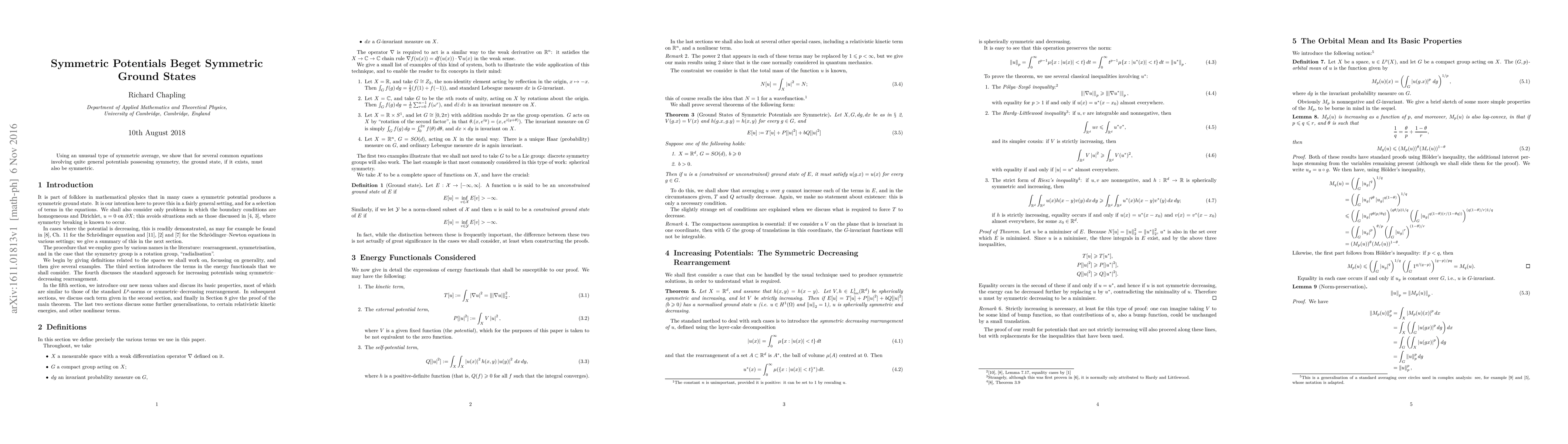 Using an unusual type of symmetric average, we show that for several common equations involving quite general potentials possessing symmetry, the ground state, if it exists, must also be symmetric.
