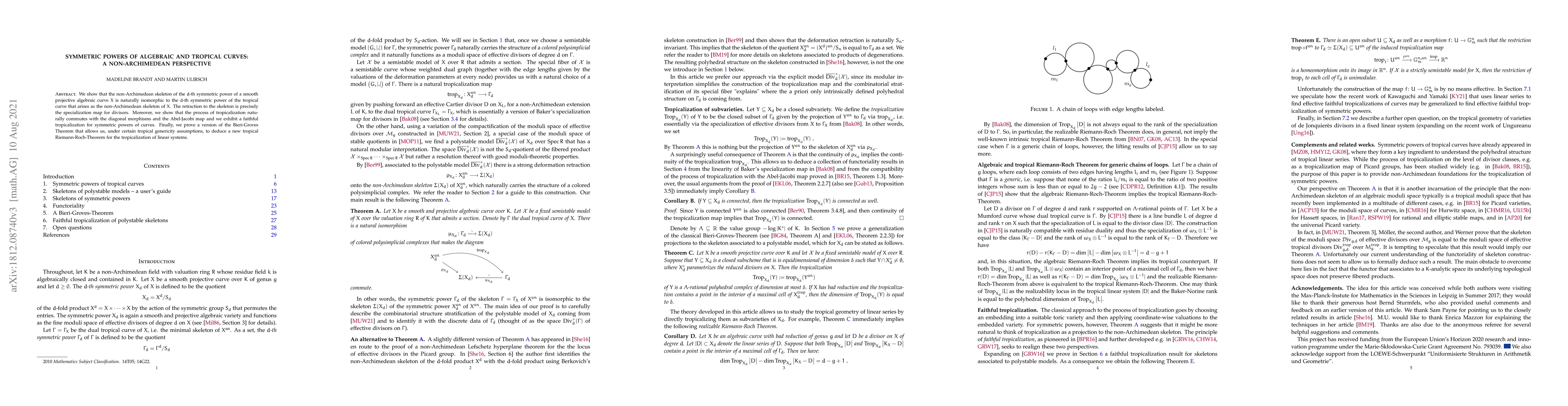 This paper establishes an isomorphism between the non-Archimedean skeleton of the $d$-th symmetric power of an algebraic curve $X$ and the $d$-th symmetric power of its tropical counterpart, showing that tropicalization commutes with diagonal morphisms and the Abel-Jacobi map. It also proves a tropical version of the Bieri-Groves Theorem leading to a new tropical Riemann-Roch Theorem.