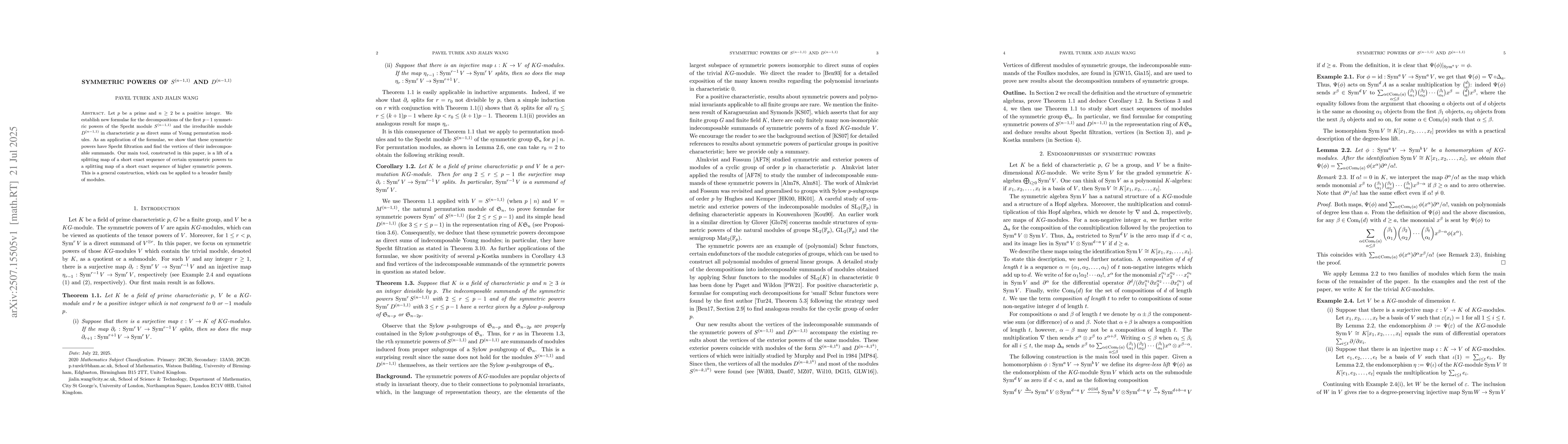 Let $p$ be a prime and $n\geq 2$ be a positive integer. We establish new formulae for the decompositions of the first $p-1$ symmetric powers of the Specht module $S^{(n-1,1)}$ and the irreducible module $D^{(n-1,1)}$ in characteristic $p$ as direct sums of Young permutation modules. As an application of the formulae, we show that these symmetric powers have Specht filtration and find the vertices of their indecomposable summands. Our main tool, constructed in this paper, is a lift of a splitting map of a short exact sequence of certain symmetric powers to a splitting map of a short exact sequence of higher symmetric powers. This is a general construction, which can be applied to a broader family of modules.
