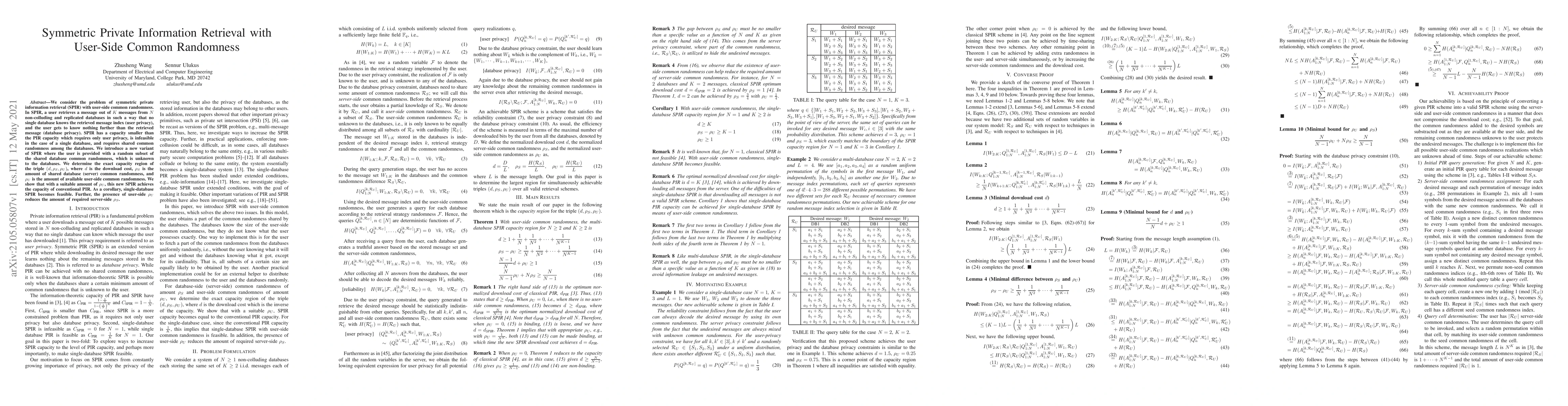 We consider the problem of symmetric private information retrieval (SPIR) with user-side common randomness. In SPIR, a user retrieves a message out of $K$ messages from $N$ non-colluding and replicated databases in such a way that no single database knows the retrieved message index (user privacy), and the user gets to know nothing further than the retrieved message (database privacy). SPIR has a capacity smaller than the PIR capacity which requires only user privacy, is infeasible in the case of a single database, and requires shared common randomness among the databases. We introduce a new variant of SPIR where the user is provided with a random subset of the shared database common randomness, which is unknown to the databases. We determine the exact capacity region of the triple $(d, \rho_S, \rho_U)$, where $d$ is the download cost, $\rho_S$ is the amount of shared database (server) common randomness, and $\rho_U$ is the amount of available user-side common randomness. We show that with a suitable amount of $\rho_U$, this new SPIR achieves the capacity of conventional PIR. As a corollary, single-database SPIR becomes feasible. Further, the presence of user-side $\rho_U$ reduces the amount of required server-side $\rho_S$.