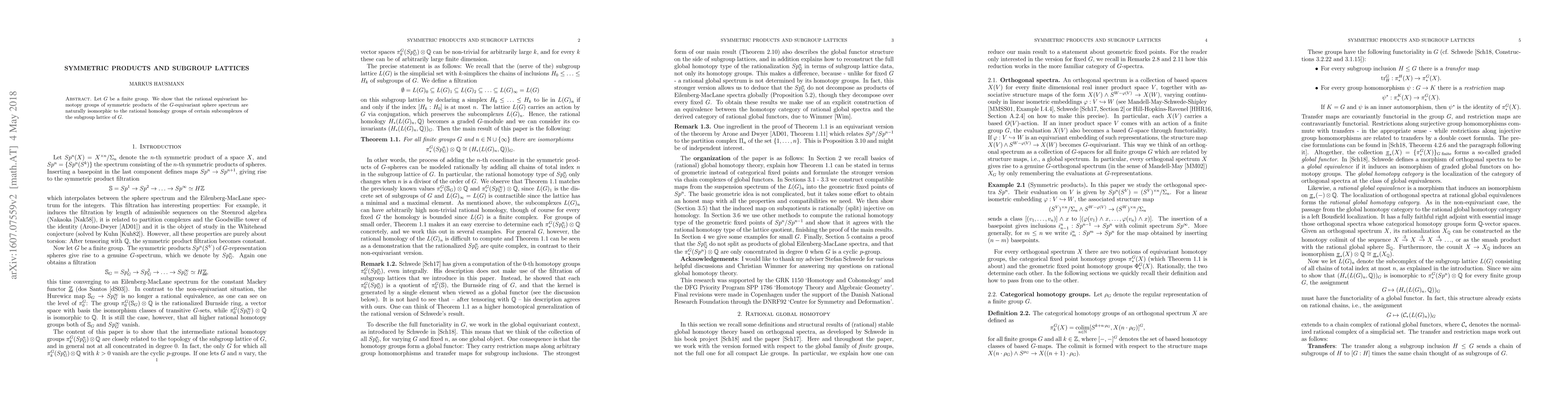 This paper demonstrates that the rational homotopy groups of symmetric products of the G-equivariant sphere spectrum are naturally isomorphic to the rational homology groups of specific subcomplexes derived from the subgroup lattice of a finite group G. This establishes a connection between algebraic topology and group theory.