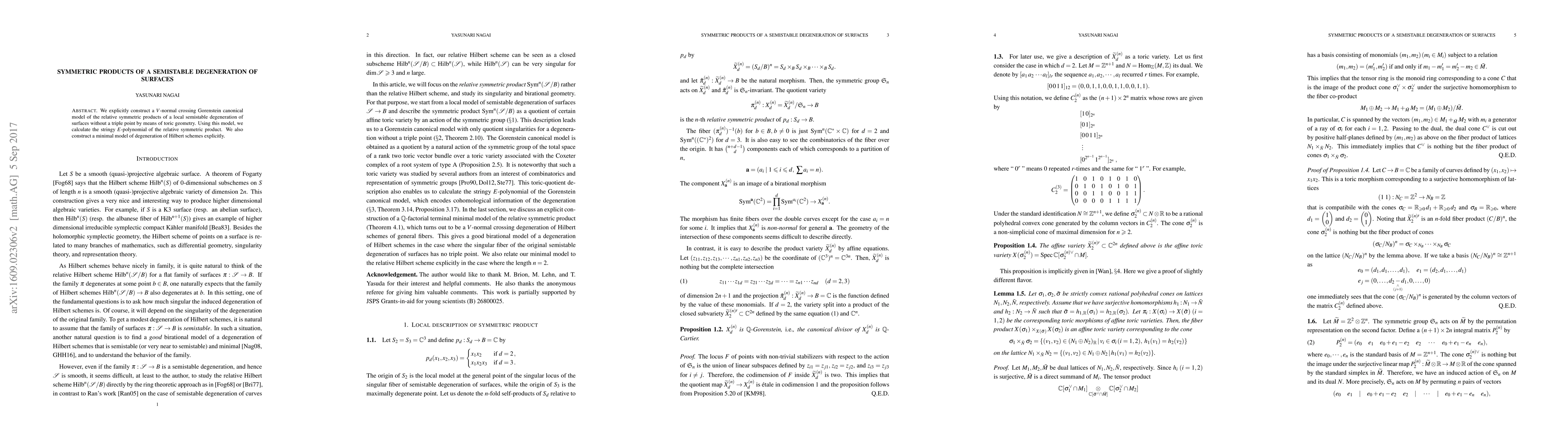This paper constructs a $V$-normal crossing Gorenstein model for the relative symmetric products of a local semistable degeneration of surfaces via toric geometry and computes the stringy $E$-polynomial. Additionally, it presents an explicit minimal model for the degeneration of Hilbert schemes.