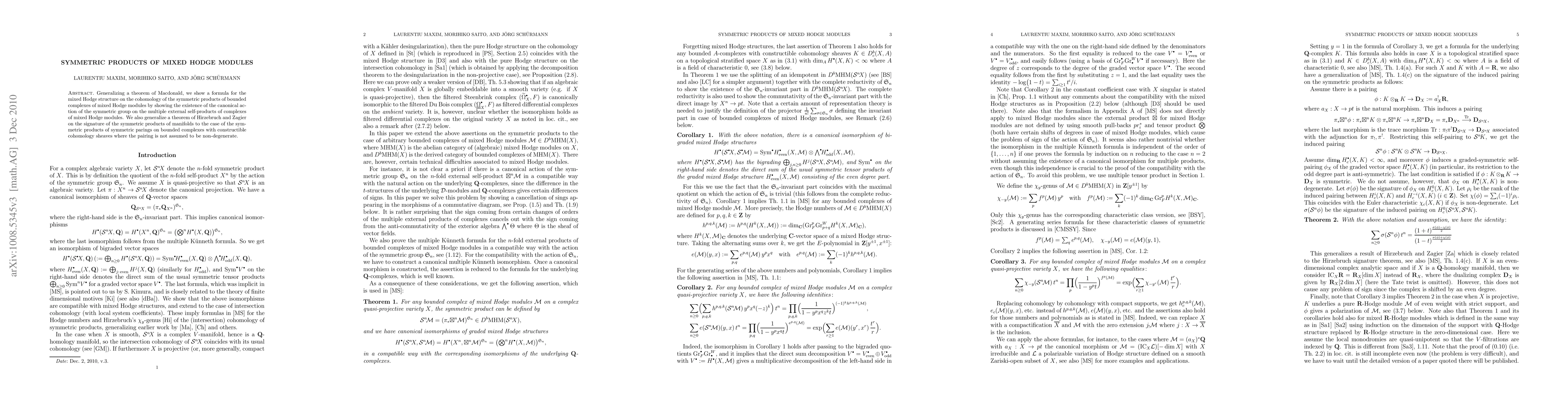 This paper generalizes Macdonald's theorem to establish a mixed Hodge structure on the cohomology of symmetric products of bounded complexes of mixed Hodge modules, demonstrating the canonical action of the symmetric group. It also extends Hirzebruch and Zagier's signature theorem to the symmetric products of symmetric pairings on such complexes, even when the pairing is not non-degenerate.