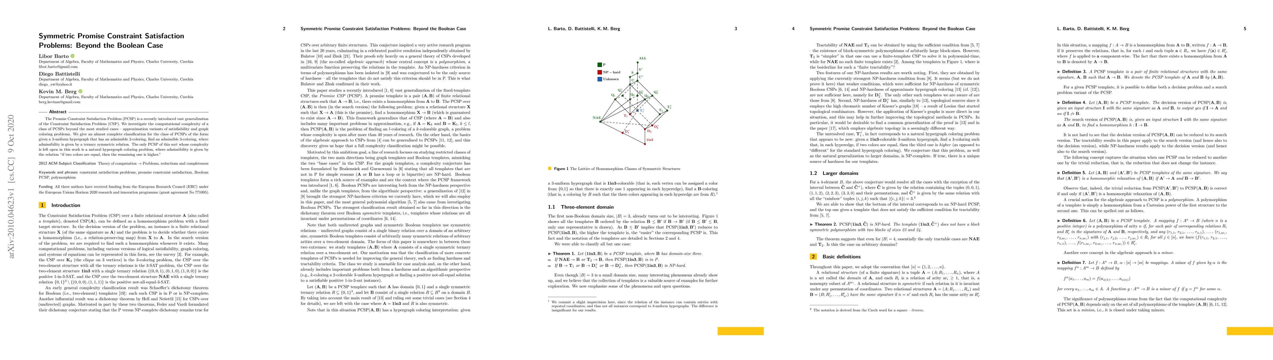 This paper classifies the computational complexity of symmetric promise constraint satisfaction problems beyond Boolean cases, focusing on 3-uniform hypergraph coloring problems defined by ternary symmetric relations. The only unresolved complexity is for a specific hypergraph coloring problem where admissibility is determined by a particular ternary relation.