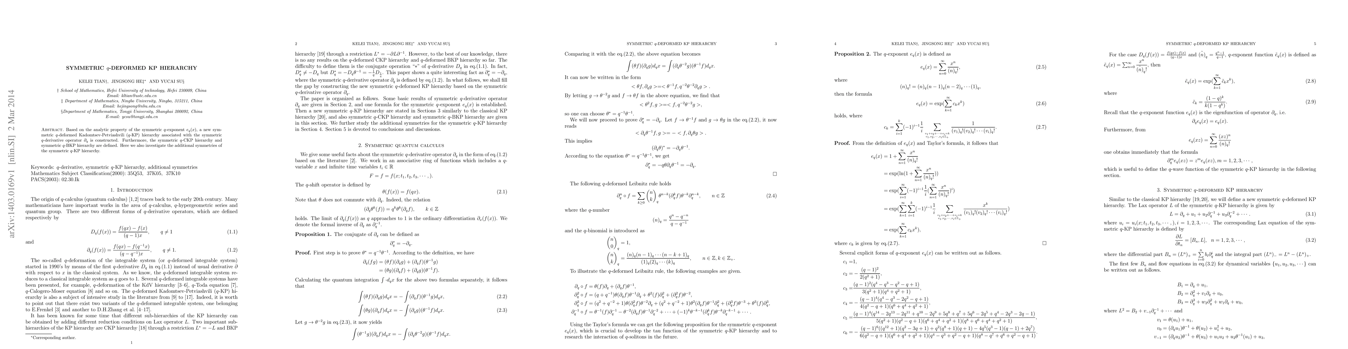 This paper constructs a new symmetric $q$-deformed Kadomtsev-Petviashvili (KP) hierarchy using the symmetric $q$-exponent $e_q(x)$ and the symmetric $q$-derivative operator $\partial_q$. It also defines the symmetric $q$-CKP and symmetric $q$-BKP hierarchies and explores their additional symmetries.