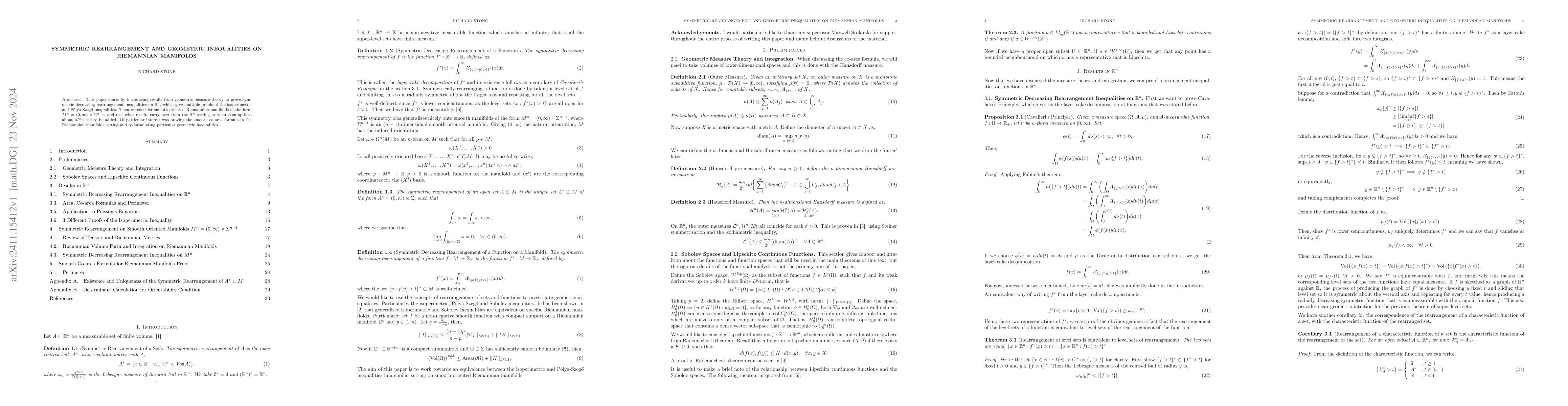 This paper proves symmetric rearrangement inequalities using geometric measure theory, providing new proofs of the isoperimetric and Pólya-Szegő inequalities. It extends these results to smooth Riemannian manifolds, focusing on the smooth co-area formula and reformulating geometric inequalities for this setting.
