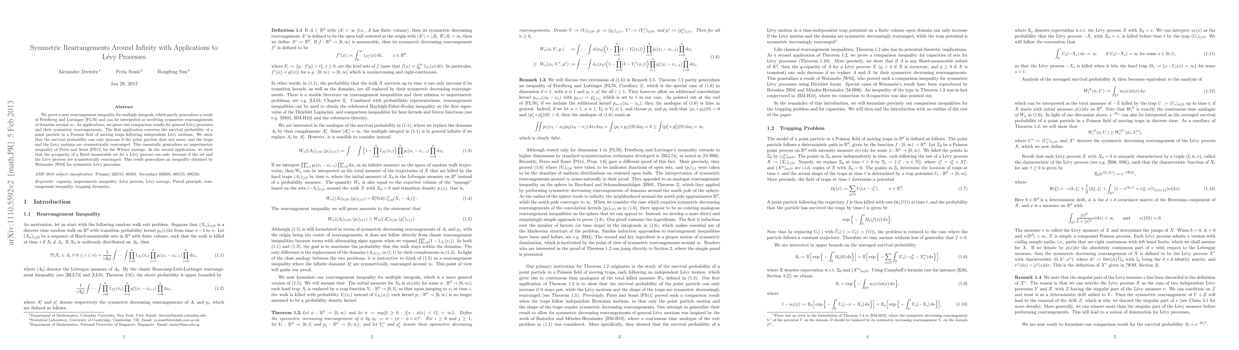 This paper proves a new rearrangement inequality for multiple integrals involving symmetric rearrangements around infinity, extending previous results. It applies this inequality to show that the survival probability of a particle in a Poisson field of moving traps and the q-capacity of a set for a Levy process can only increase or decrease, respectively, under symmetric rearrangements.