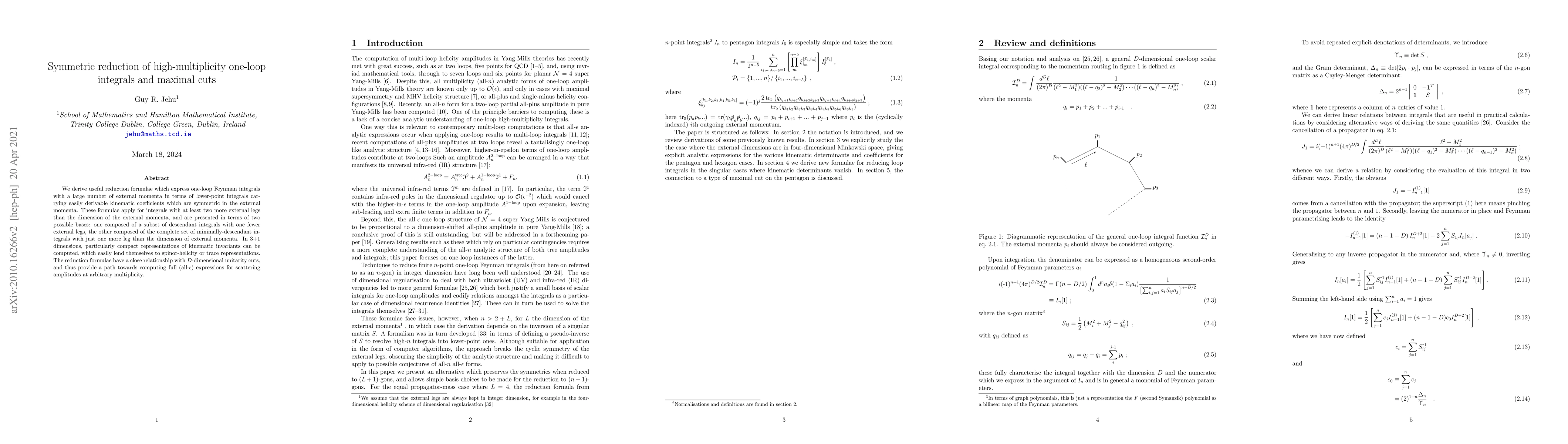 We derive useful reduction formulae which express one-loop Feynman integrals with a large number of external momenta in terms of lower-point integrals carrying easily derivable kinematic coefficients which are symmetric in the external momenta. These formulae apply for integrals with at least two more external legs than the dimension of the external momenta, and are presented in terms of two possible bases: one composed of a subset of descendant integrals with one fewer external legs, the other composed of the complete set of minimally-descendant integrals with just one more leg than the dimension of external momenta. In 3+1 dimensions, particularly compact representations of kinematic invariants can be computed, which easily lend themselves to spinor-helicity or trace representations. The reduction formulae have a close relationship with D-dimensional unitarity cuts, and thus provide a path towards computing full (all-epsilon) expressions for scattering at arbitrary multiplicity.