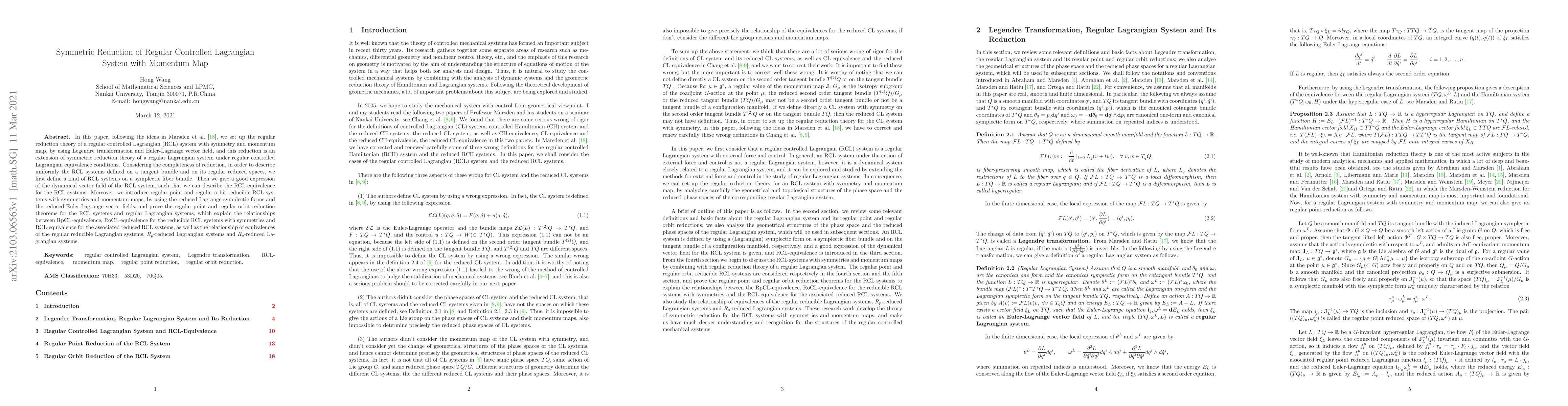 In this paper, following the ideas in Marsden et al.[18], we set up the regular reduction theory of a regular controlled Lagrangian (RCL) system with symmetry and momentum map, by using Legendre transformation and Euler-Lagrange vector field, and this reduction is an extension of symmetric reduction theory of a regular Lagrangian system under regular controlled Lagrangian equivalence conditions. Considering the completeness of reduction, in order to describe uniformly the RCL systems defined on a tangent bundle and on its regular reduced spaces, we first define a kind of RCL systems on a symplectic fiber bundle. Then we give a good expression of the dynamical vector field of the RCL system, such that we can describe the RCL-equivalence for the RCL systems. Moreover, we introduce regular point and regular orbit reducible RCL systems with symmetries and momentum maps, by using the reduced Lagrange symplectic forms and the reduced Euler-Lagrange vector fields, and prove the regular point and regular orbit reduction theorems for the RCL systems and regular Lagrangian systems, which explain the relationships between RpCL-equivalence, RoCL-equivalence for the reducible RCL systems with symmetries and RCL-equivalence for the associated reduced RCL systems, as well as the relationship of equivalences of the regular reducible Lagrangian systems, $R_p$-reduced Lagrangian systems and $R_o$-reduced Lagrangian systems.