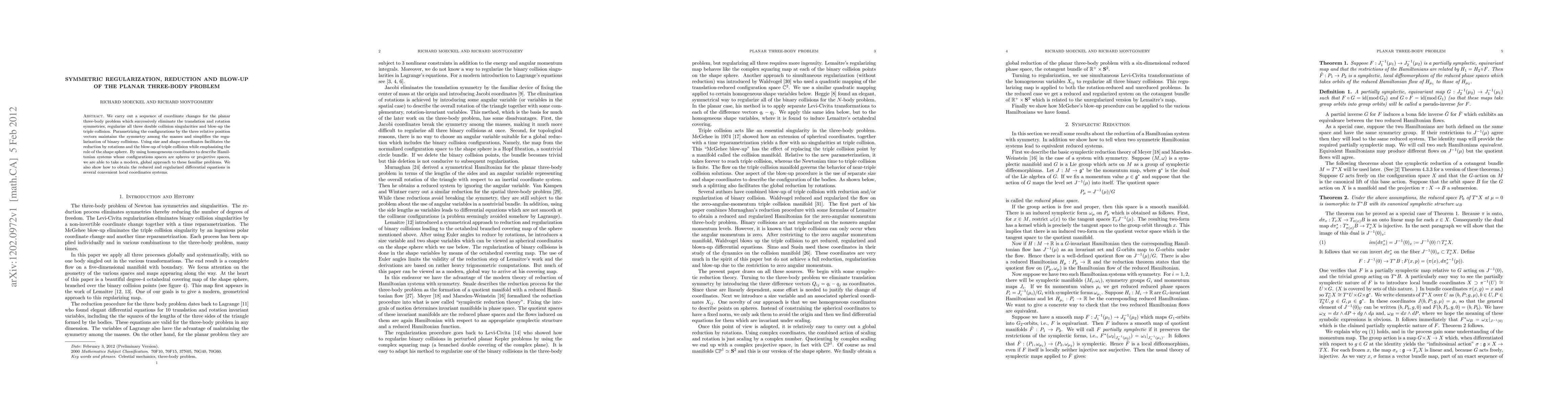 This paper explores symmetric regularization and reduction techniques for the planar three-body problem, eliminating translation and rotation symmetries, regularizing double collision singularities, and blowing up the triple collision. The use of homogeneous coordinates and size/shape coordinates facilitates a modern, global approach to these classical problems.