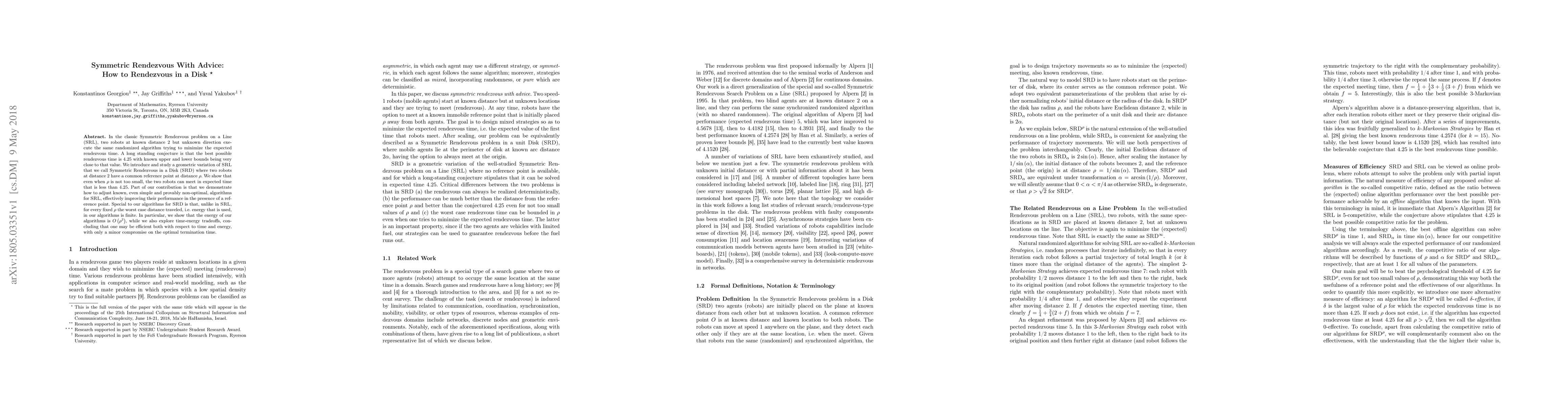 This paper introduces the Symmetric Rendezvous in a Disk problem (SRD), a variation of the classic Symmetric Rendezvous on a Line (SRL), where two robots aim to meet with a common reference point. The authors show that with a sufficiently large reference point, the expected rendezvous time can be less than the conjectured optimal time of 4.25 in SRL, and they propose algorithms that balance time and energy efficiency.